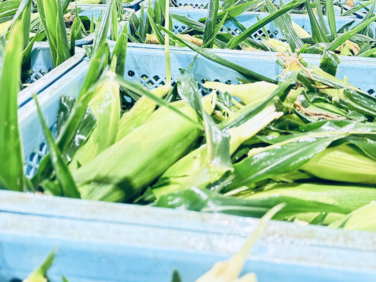 とうもろこしを収穫後すぐに真水をかけて冷房に当てることでとうもろこしから地熱を取り、選別をしたらすぐに冷蔵庫へ。