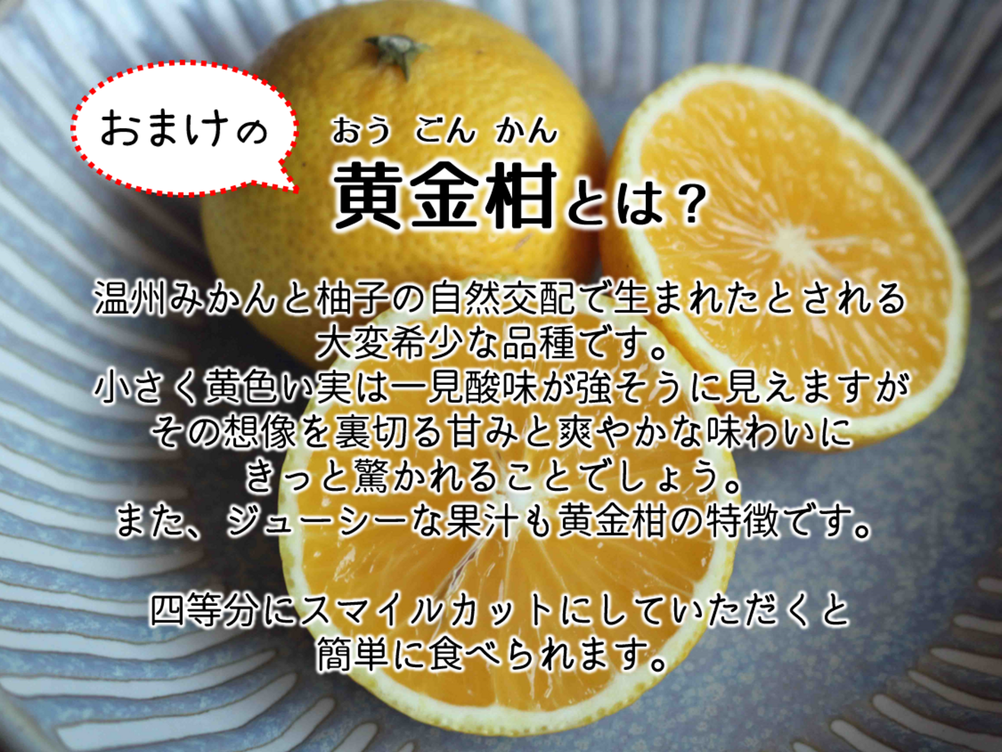 ※黄金柑はおまけとなっておりますので、黄金柑のほうに傷みがあった際は、返品・交換の対象外とさせていただきます旨ご了承ください。