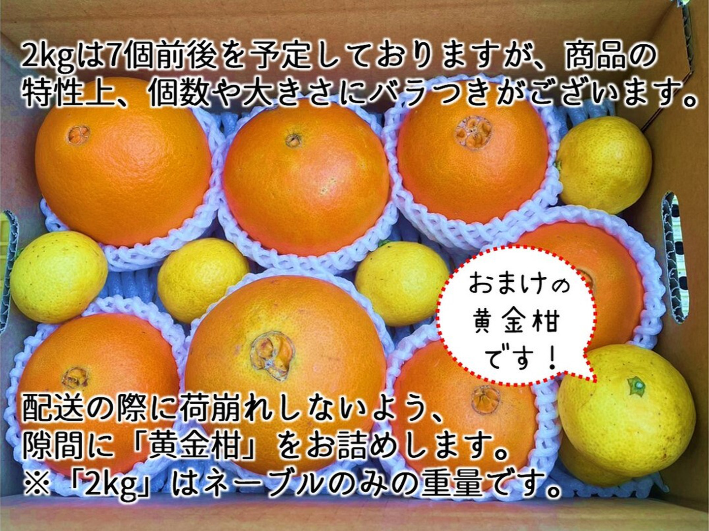 内容量は1箱2kg、サイズ混合で7個前後を予定しております。重量はネーブルのみで2kgになるよう調整しております。