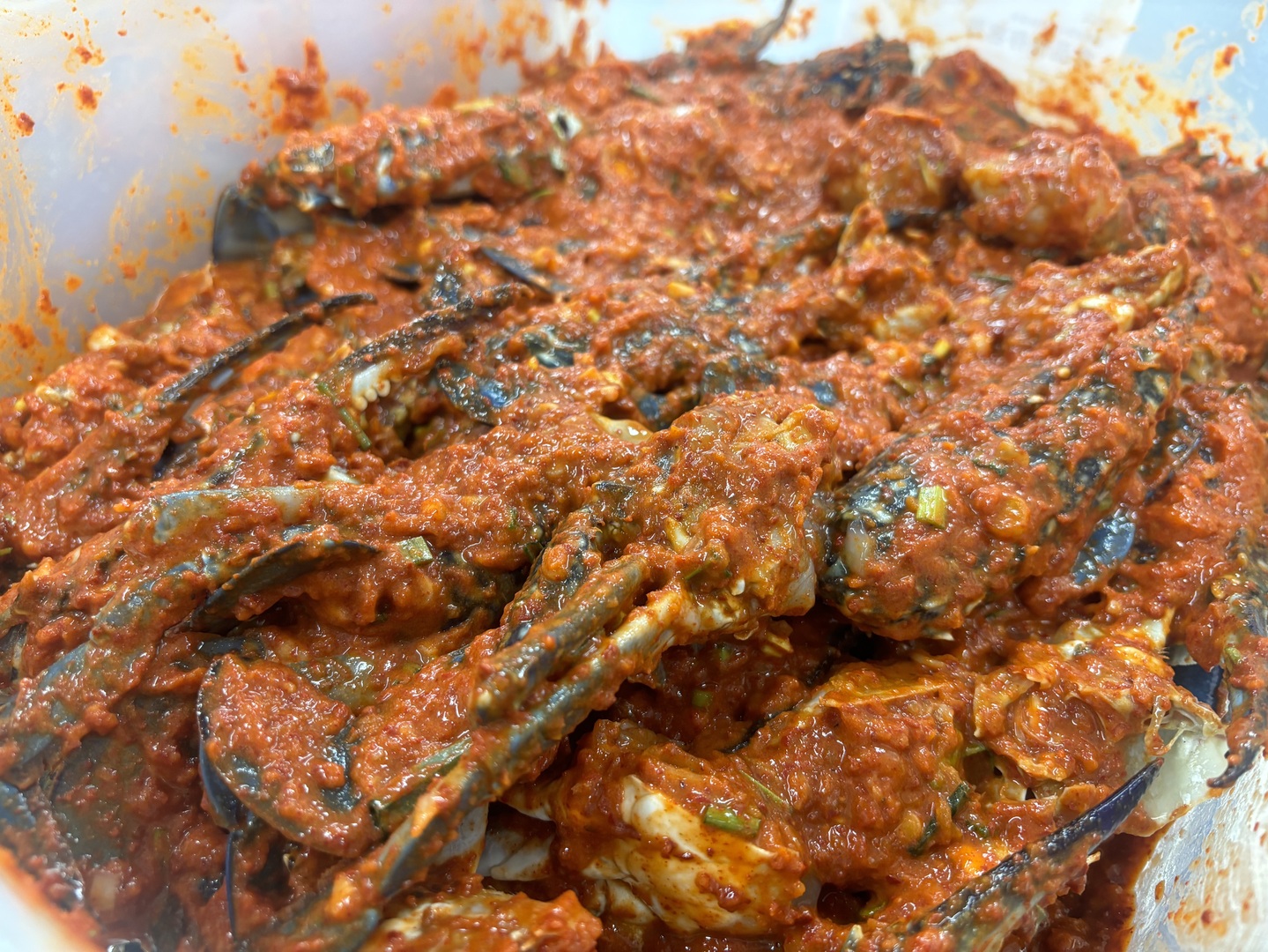 - kiwami水産特製のヤンニョムダレに浜名湖産ワタリガニを漬け込みま