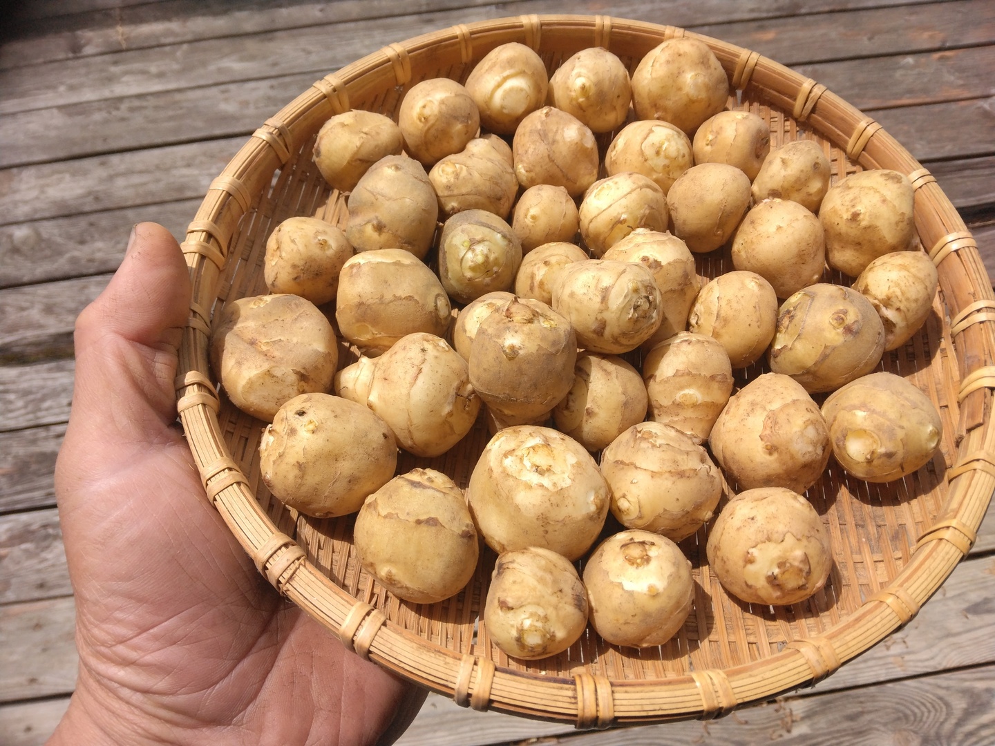 無敵(笑)に思えた菊芋ですが、この夏の旱魃の影響を受けたのかここまで小芋が大半で、ピンポン球大かそれ以下のものも多いです。まずは小芋限定の販売を開始いたしました。