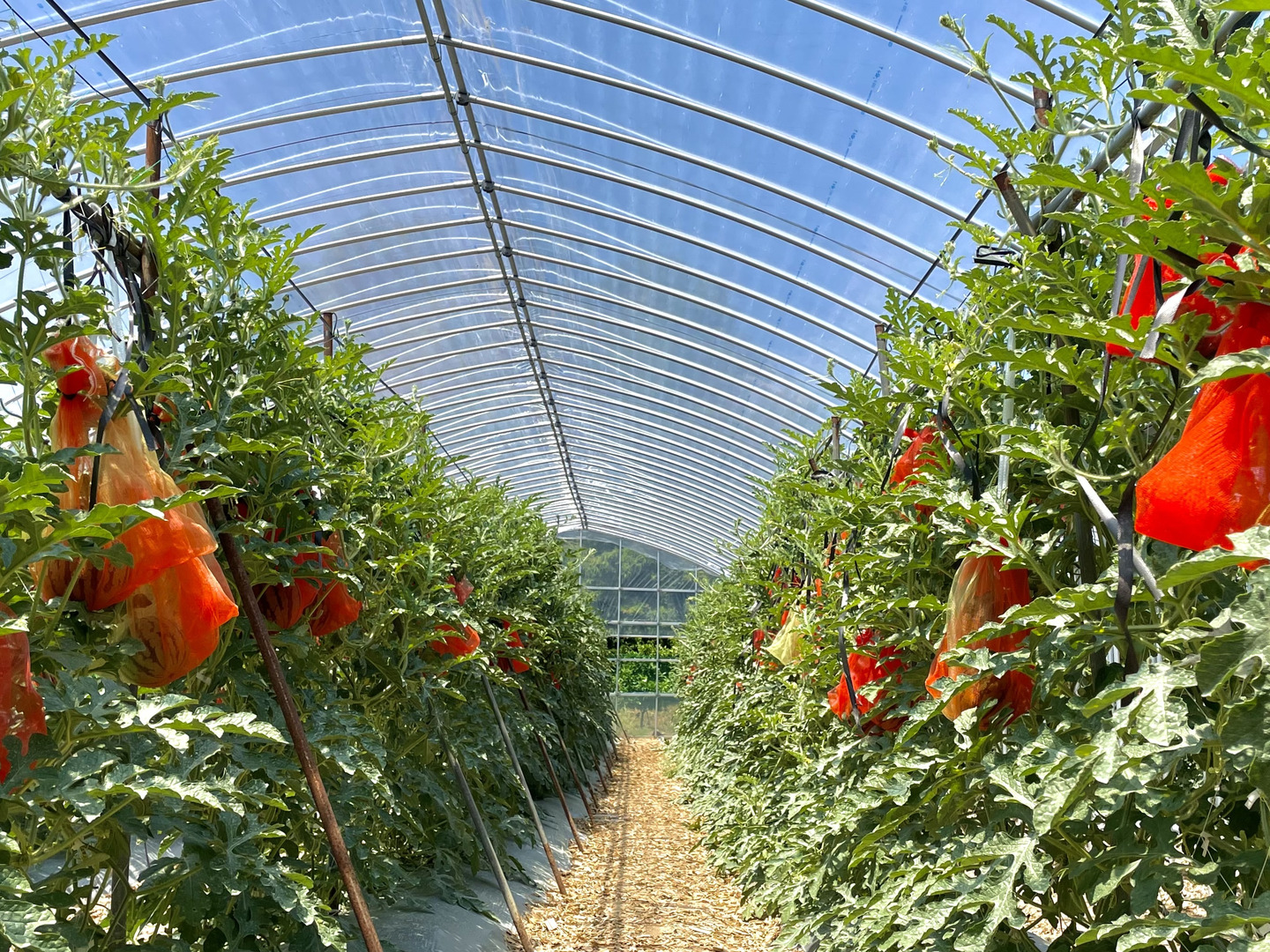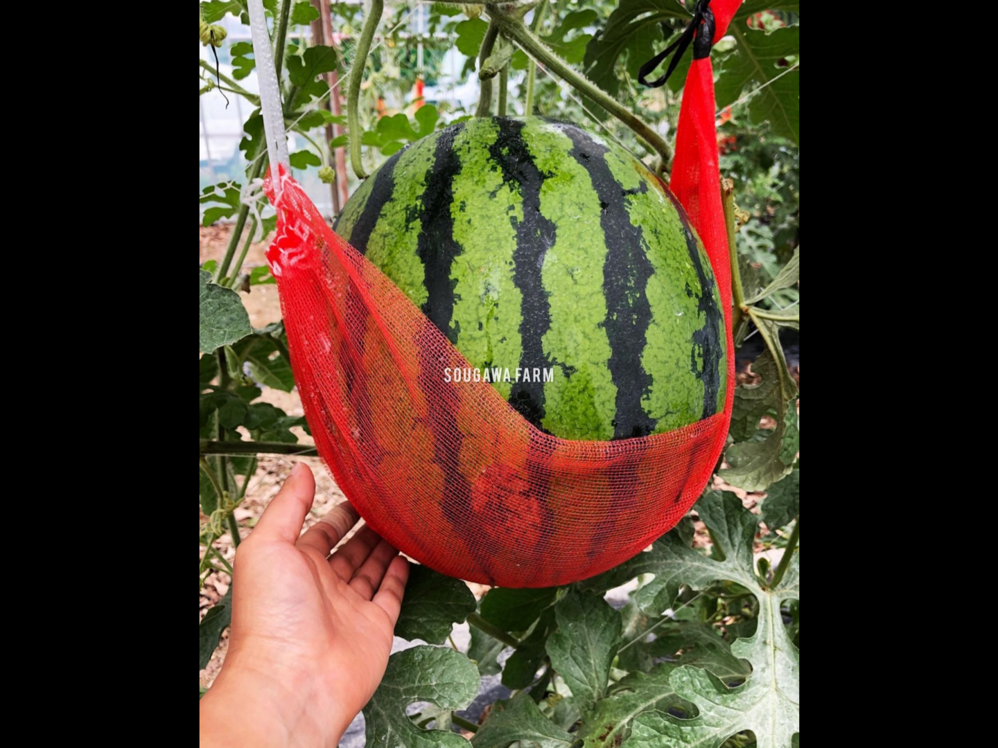 当園では、すいかを宙吊りにすることで、すいかに満遍なく日を当てて玉全体が甘くなるように工夫しています。