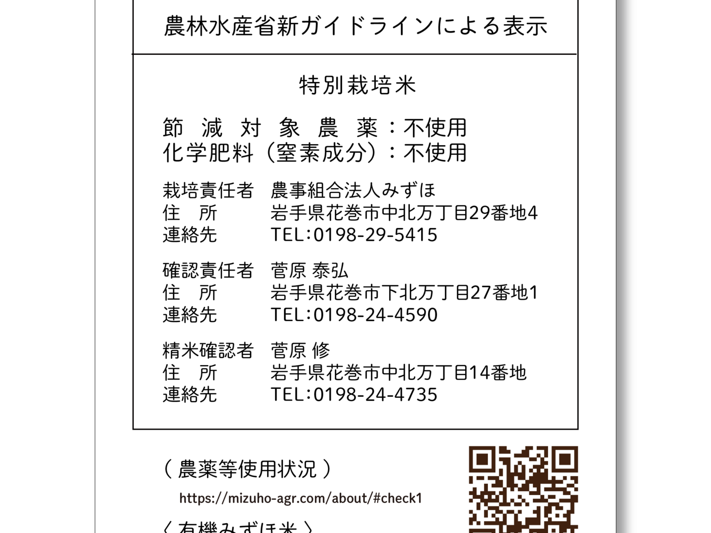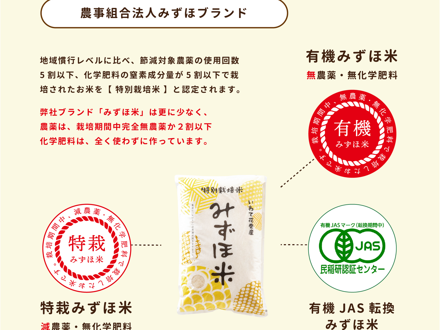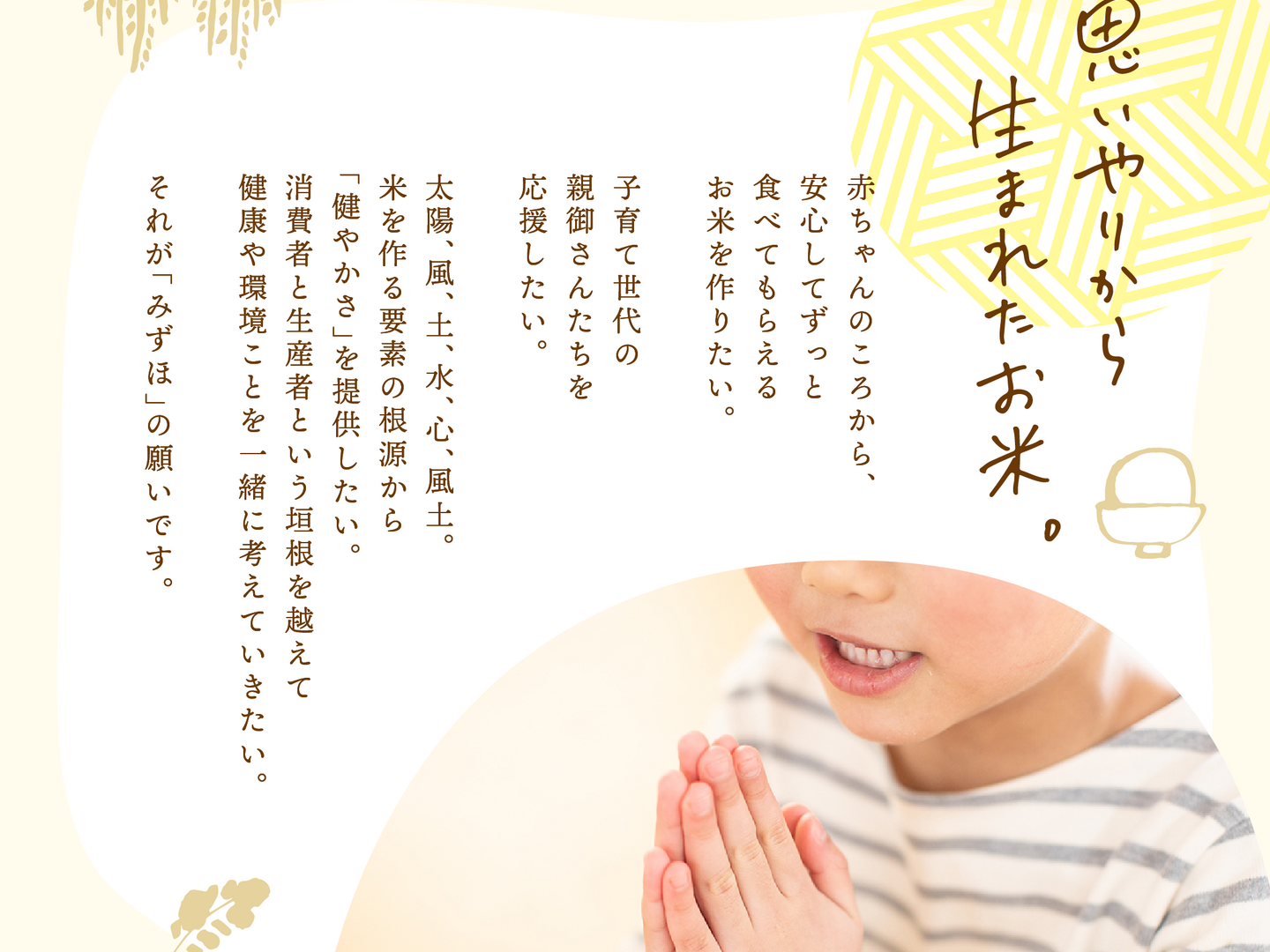 ●栽培:生産のこだわり:栽培期間中 化学肥料不使用・農薬不使用のお米です。さらに美味しさにもこだわり食味値80点以上のみを「みずほ米」と命名しました。