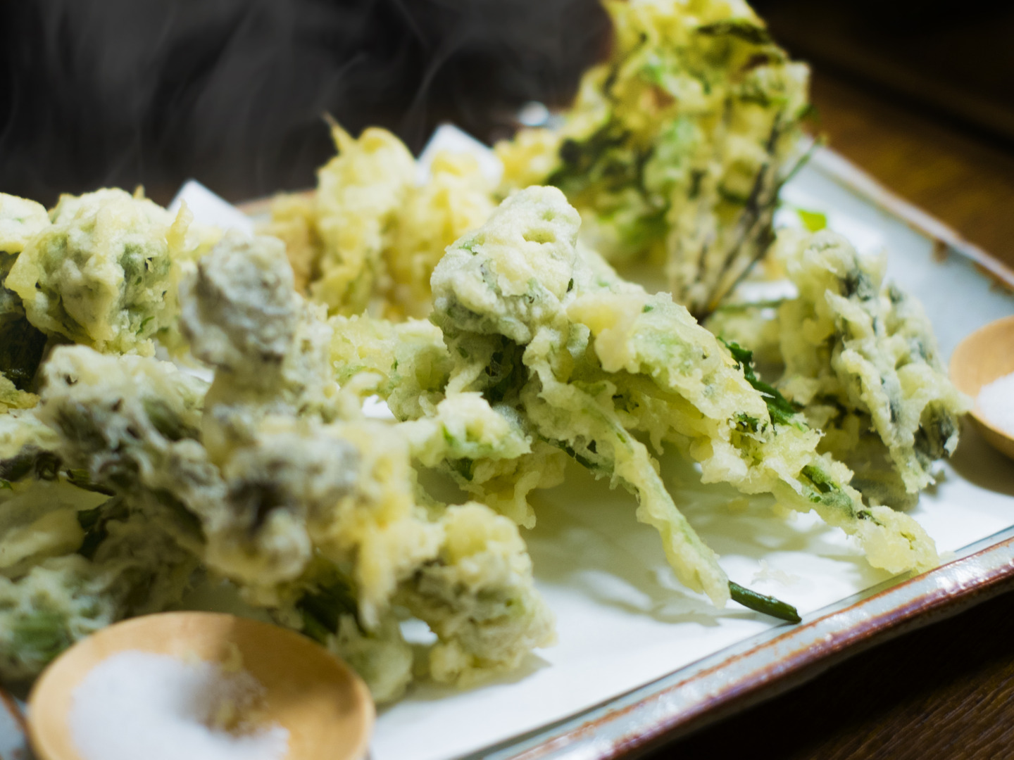 当店の山菜天ぷらセットは、季節ごとに厳選された山菜を中心に、5~6種類をセットにしました。現在ご用意しているのは、