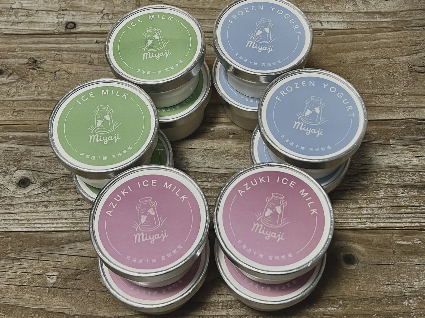 宮地牧場のグラスフェッドミルク(牧草のみで育てた牛から搾られたミルク)を原料としたアイスミルク4個,フローズンヨーグルト4個,