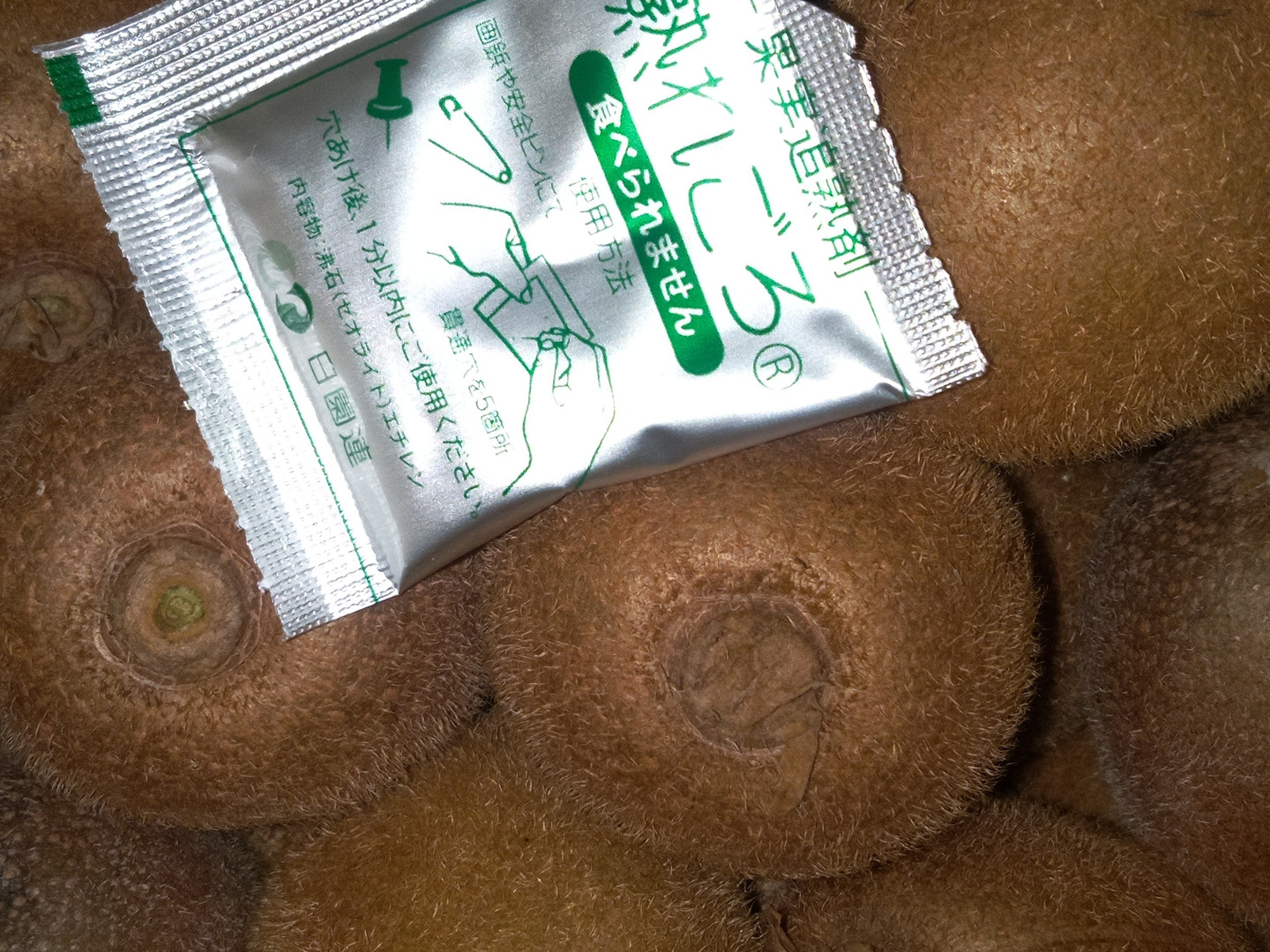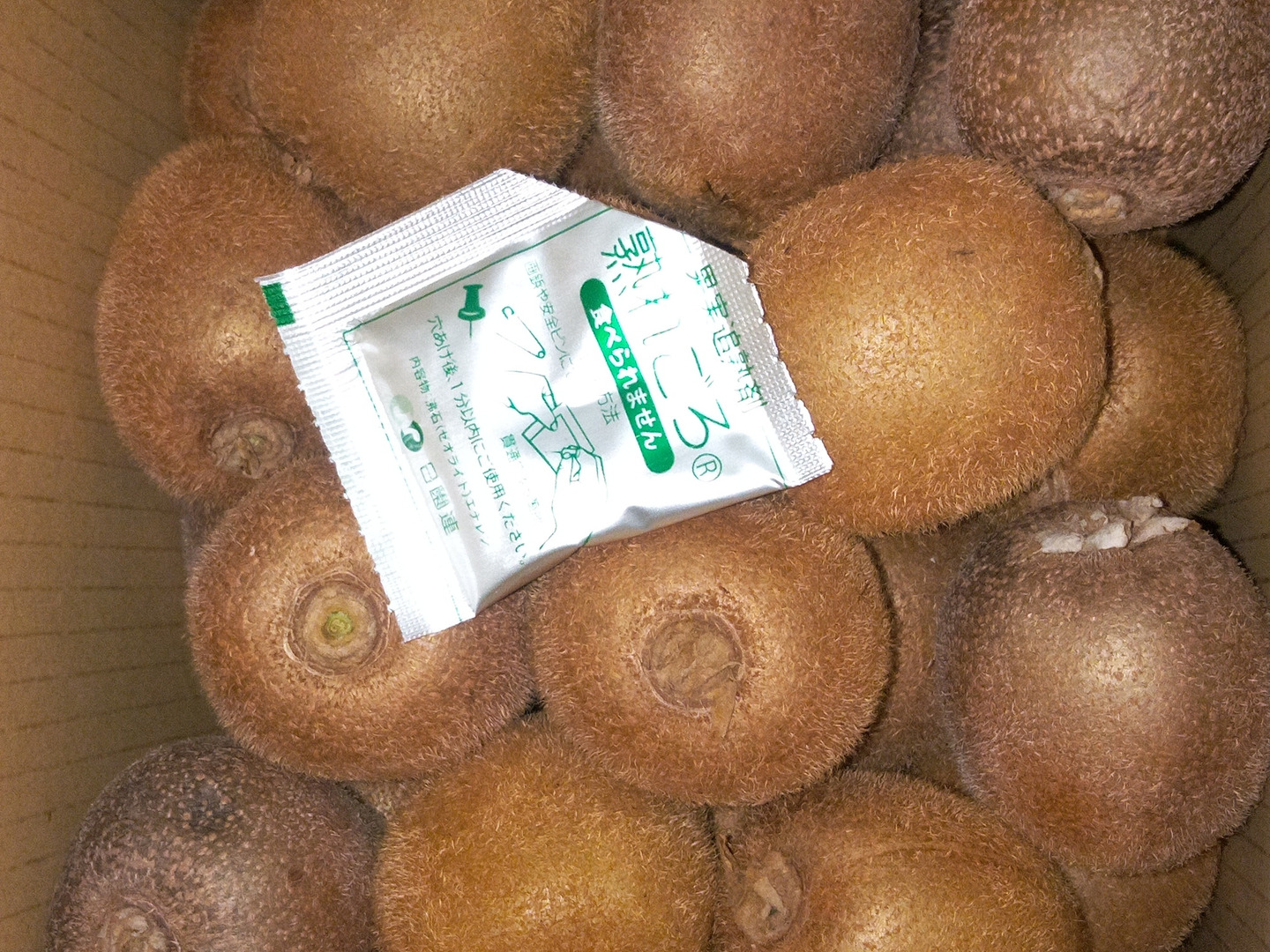 キウイフルーツは収穫後しばらく置いておくことで、果肉が柔らかくなったり甘みが増したりします。このことを追熟と言います。お手軽に追熟できる「熟れごろ」を同封します。「熟れごろ」を開封し、1分以内に密封状態の中に未熟果実を入れて下さい。