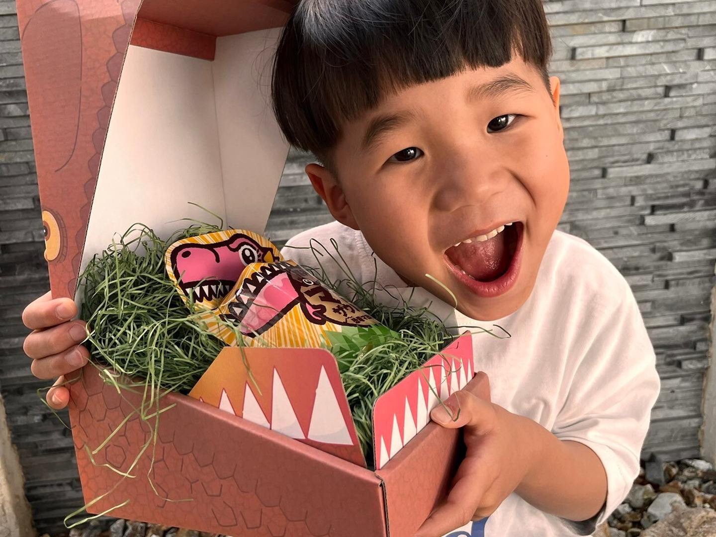 カスタードのようなふんわりとした食感が新しい人気のマヨネーズを福井のお土産用としてかわいい恐竜仕様にしました。