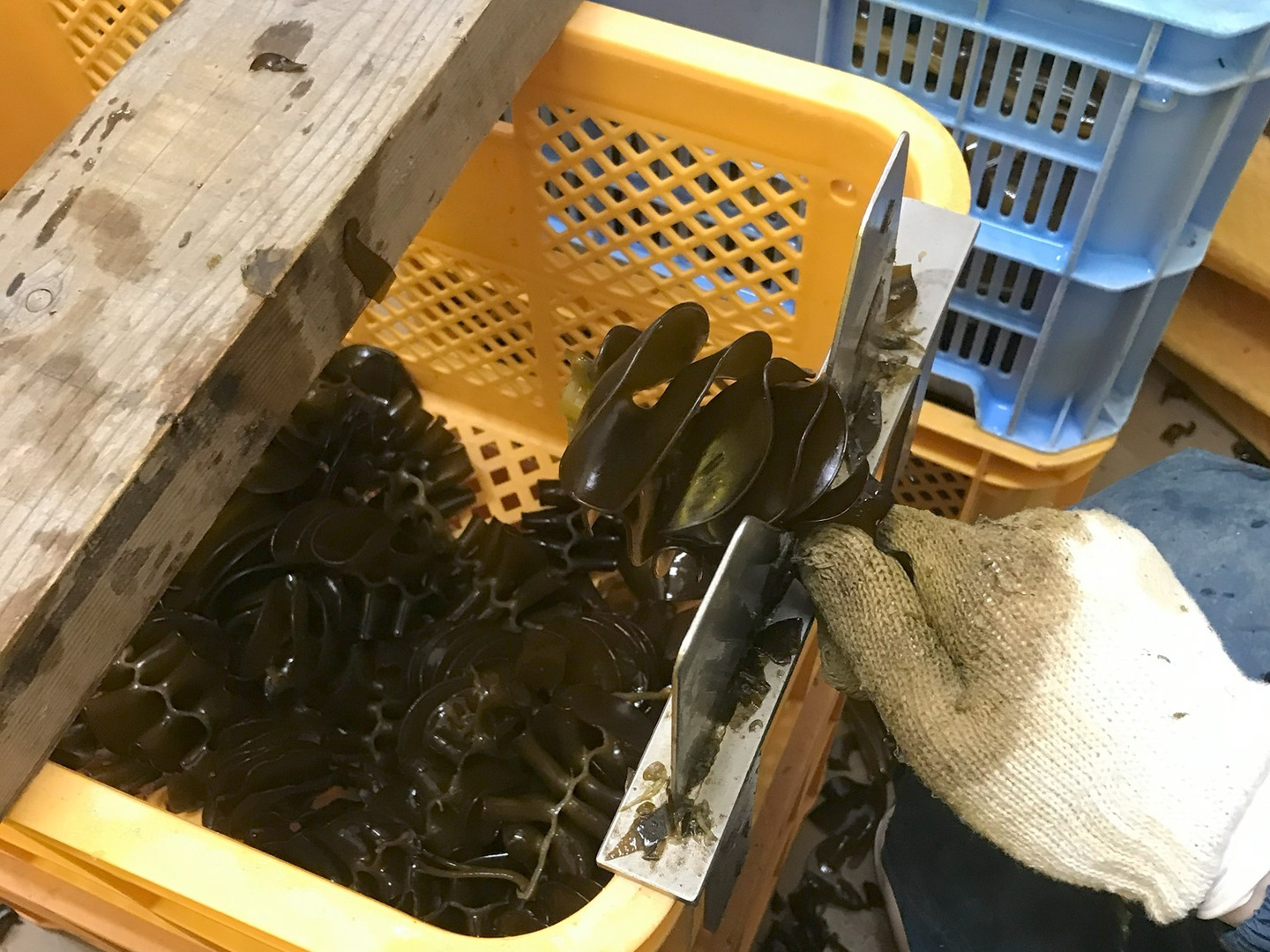 写真のように、収穫からほぼ手作業で、今年は4月末から『めかぶ』の加工が始まります。今回はできたての新物をご提供いたします。