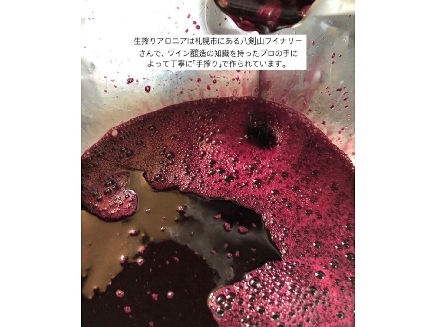 生搾りアロニアはワイナリーで丁寧に搾汁することで製法のみでアロニア特有の渋みを和らげ、ほのかな酸味と甘みを引き立てフルーティな口当たりに仕上げました。