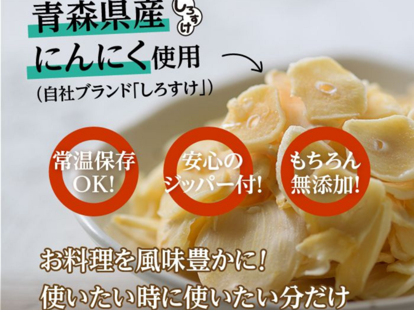 自社生産した青森産福地ホワイトをさらに自社基準で自社ブランド化して【しろすけ】と位置し、それを原料ににんにくスライスチップが作られます。