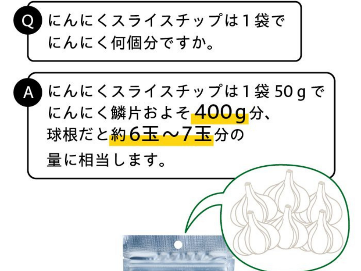 自社生産した青森産福地ホワイトをさらに自社基準で自社ブランド化して【しろすけ】と位置し、それを原料ににんにくスライスチップが作られます。