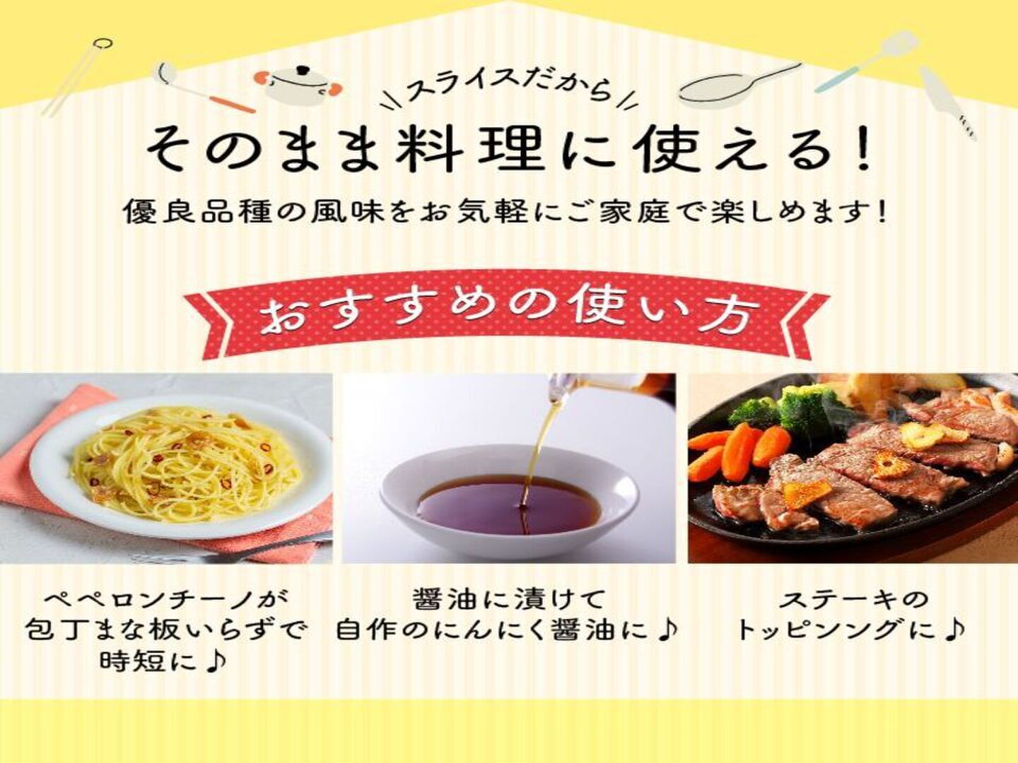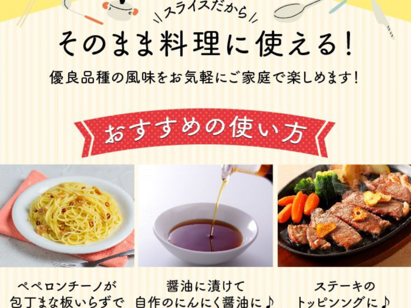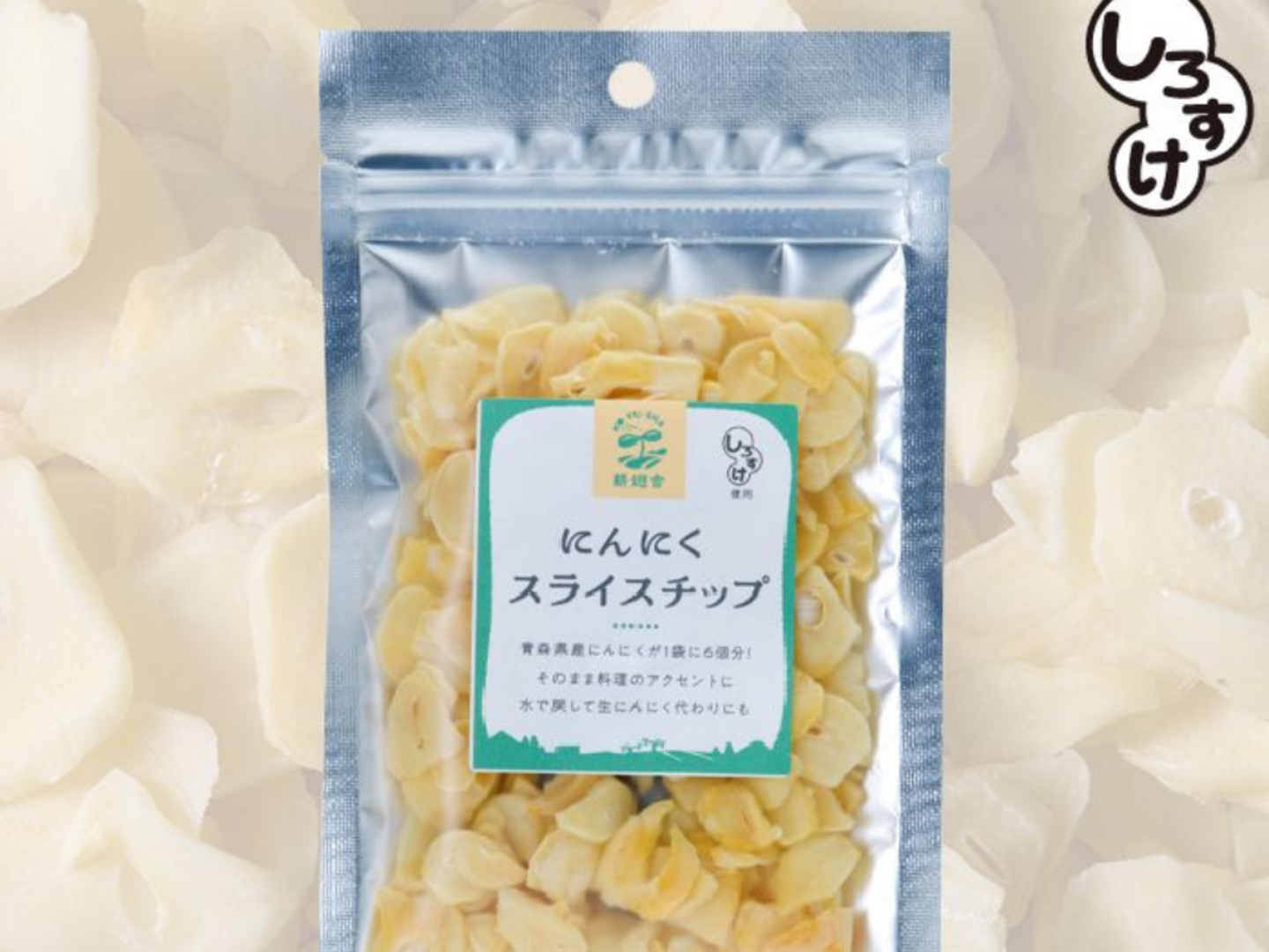 自社生産した青森産福地ホワイトをさらに自社基準で自社ブランド化して【しろすけ】と位置し、それを原料ににんにくスライスチップが作られます。