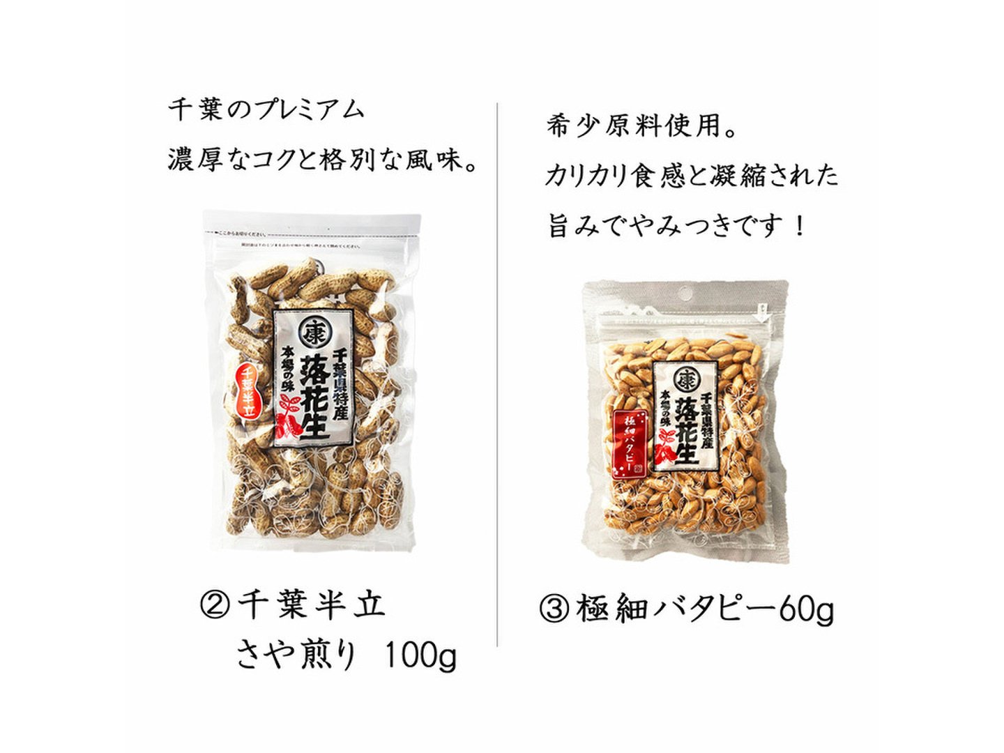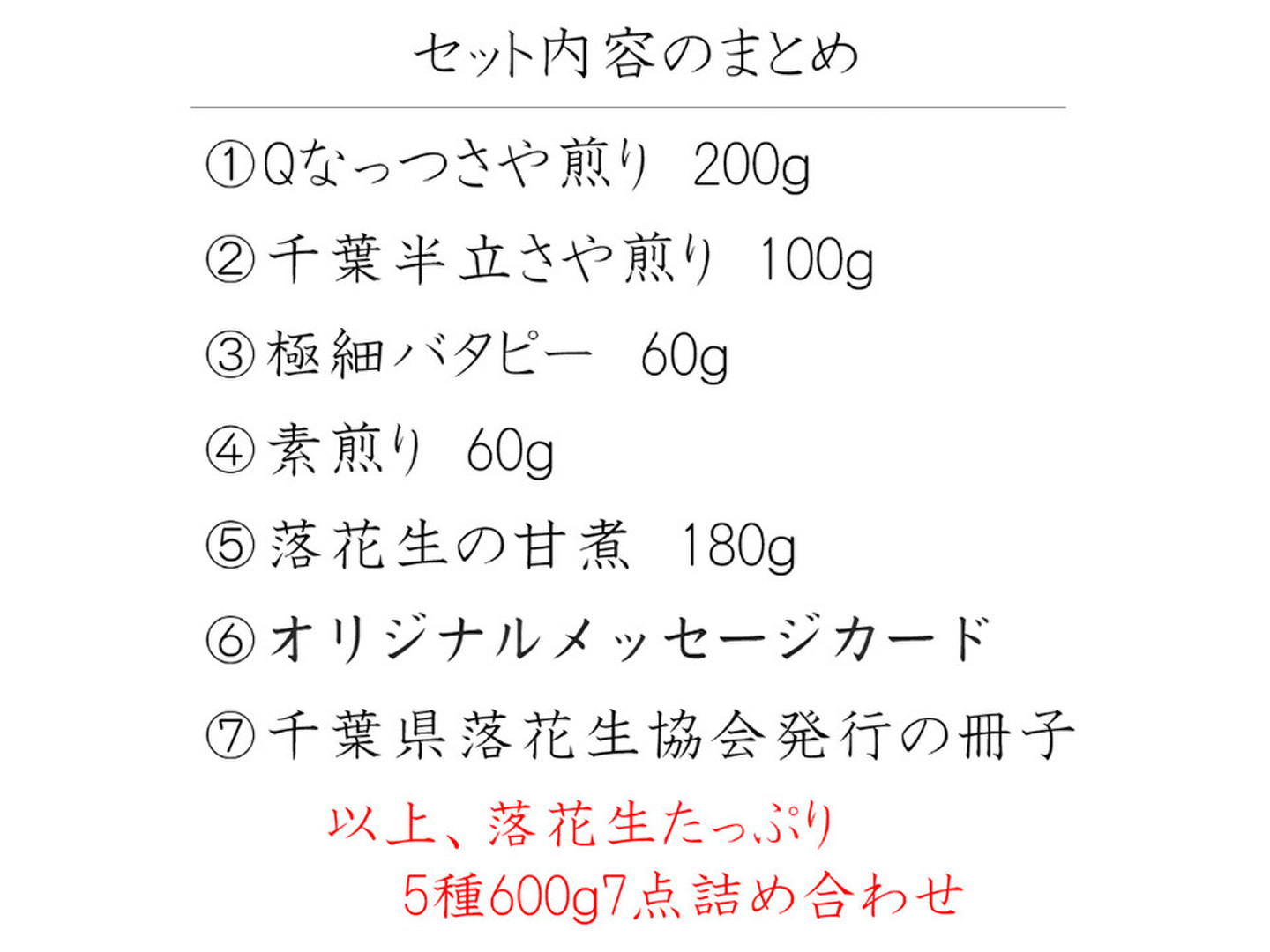 | 内容 | 千葉半立100g 、Qなっつ200g、極細バタピー60g、素煎り60g、甘煮180g | ||||||