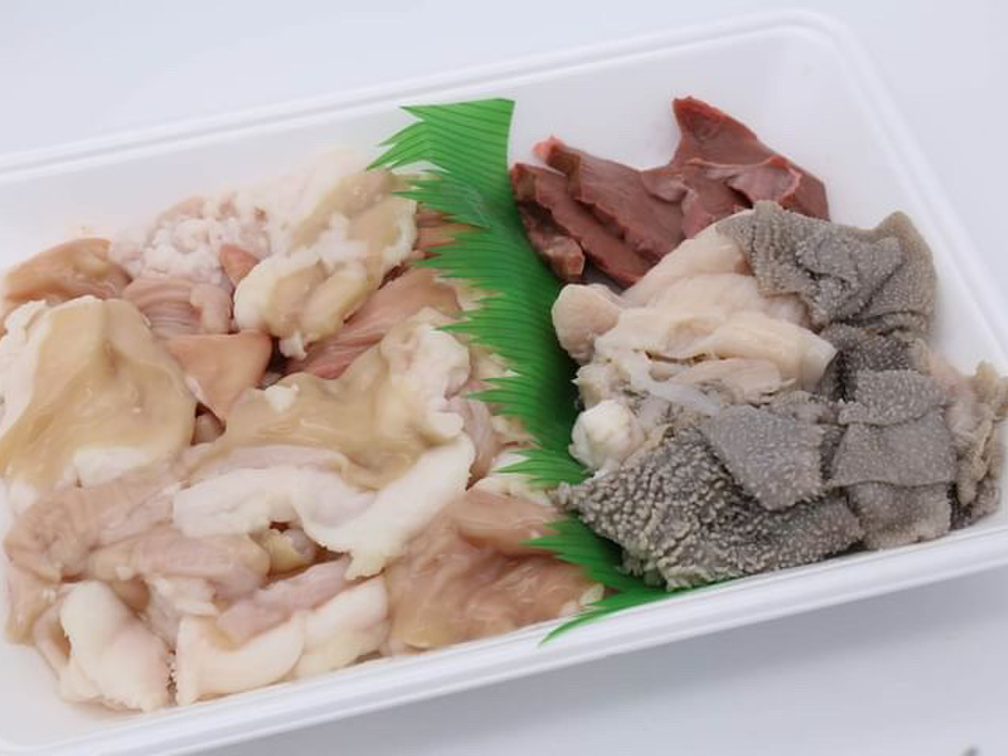 牛の「大腸、小腸、ミノ、ハチノス、センマイ、ギアラ、ハツ」をミックスしています。