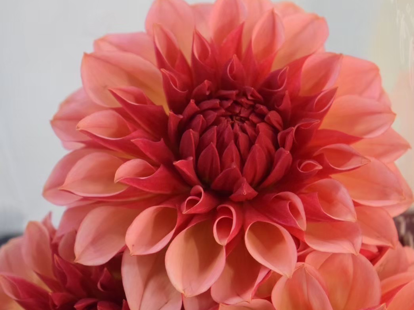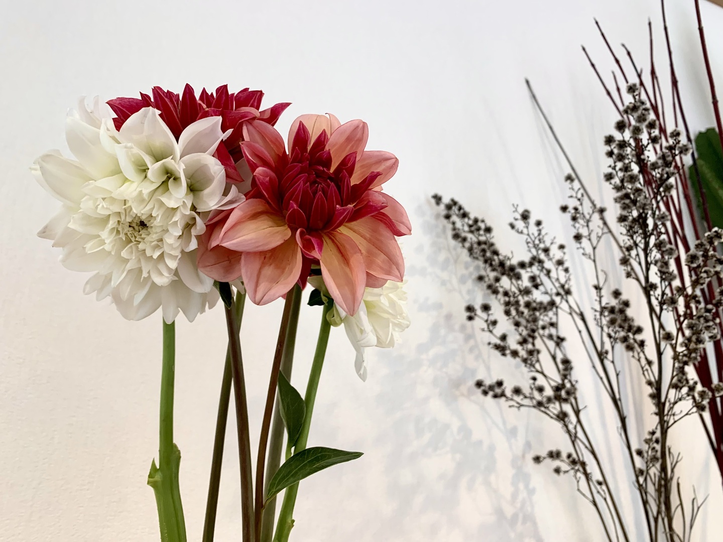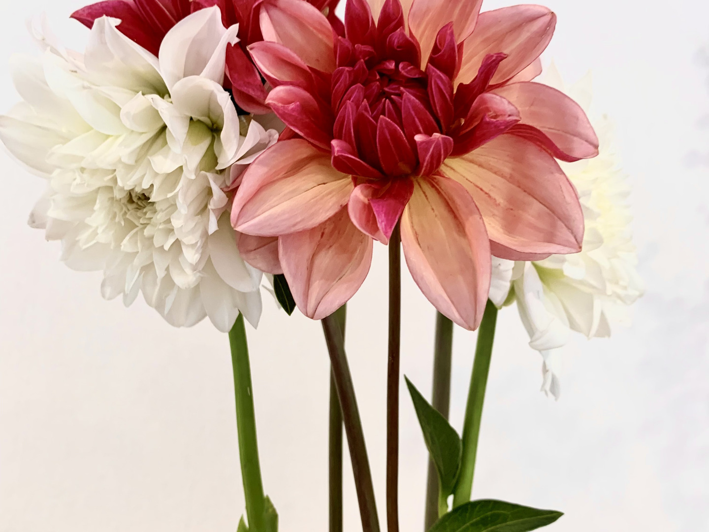 【鮮やか新鮮】ダリア花束(暖色・赤・白 系)エレガントMix 6 本(40〜50cm)