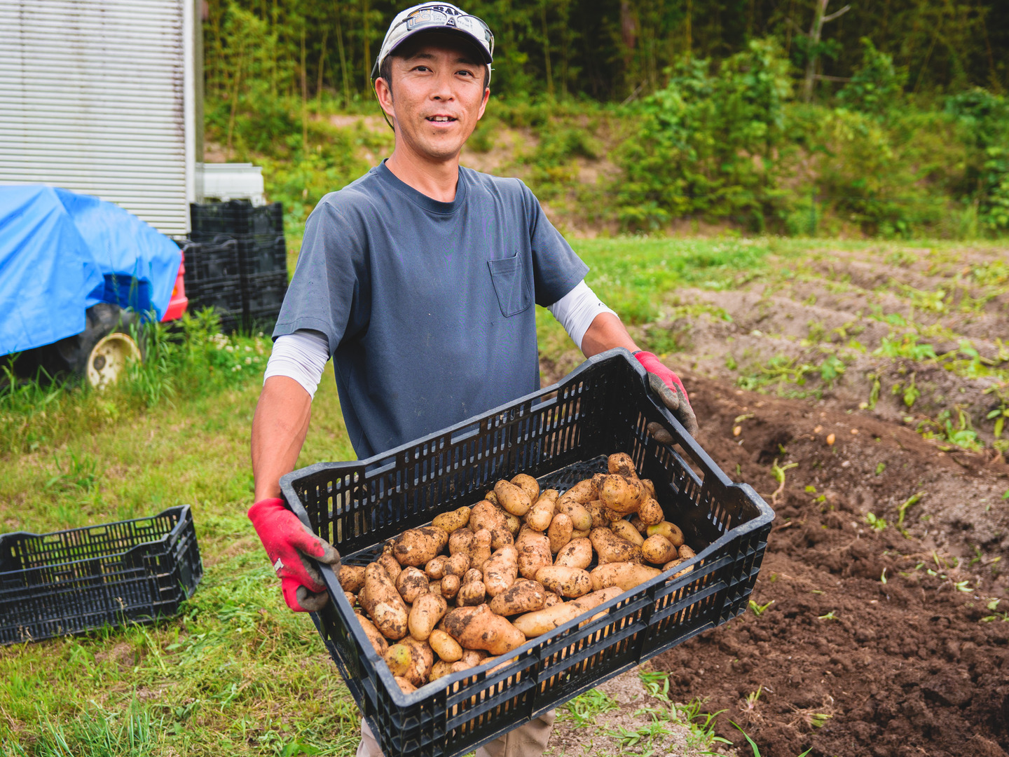 6月にお届けするのは3月上旬に植え付けをした春ジャガで品種はキタアカリ、男爵、メークインです。これらのジャガイモを、北海道では5月頃に植えつけ9月から10月頃に収穫されます。