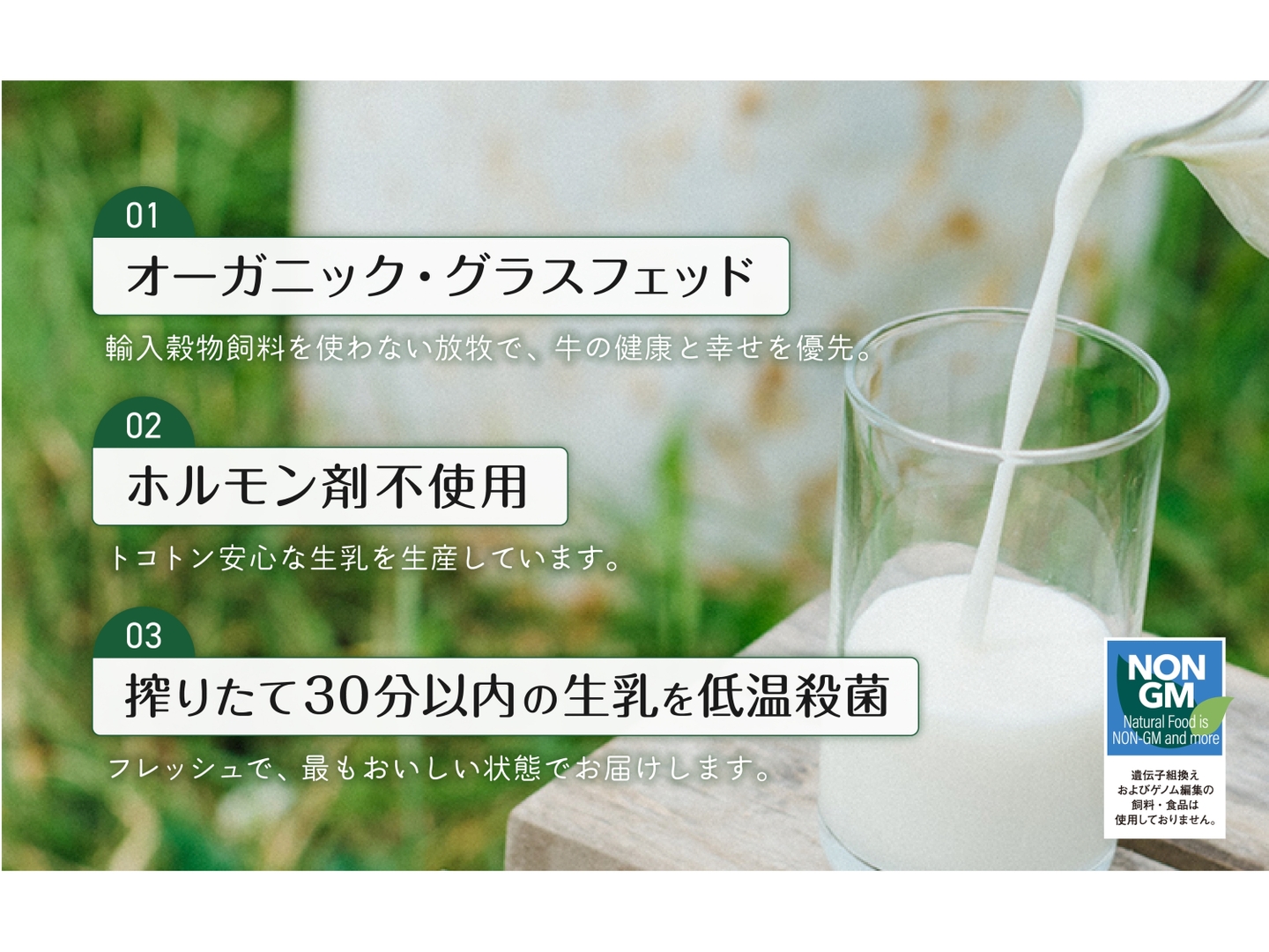 - 搾りたて30分以内の生乳を、63℃30分間低温殺菌(ノンホモ)
