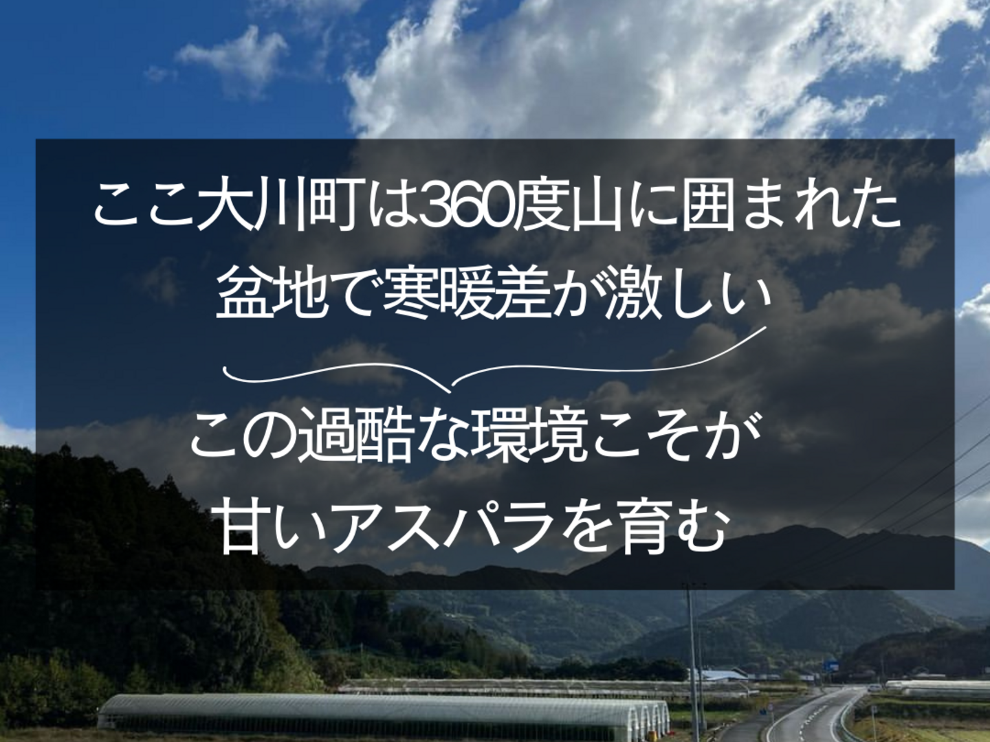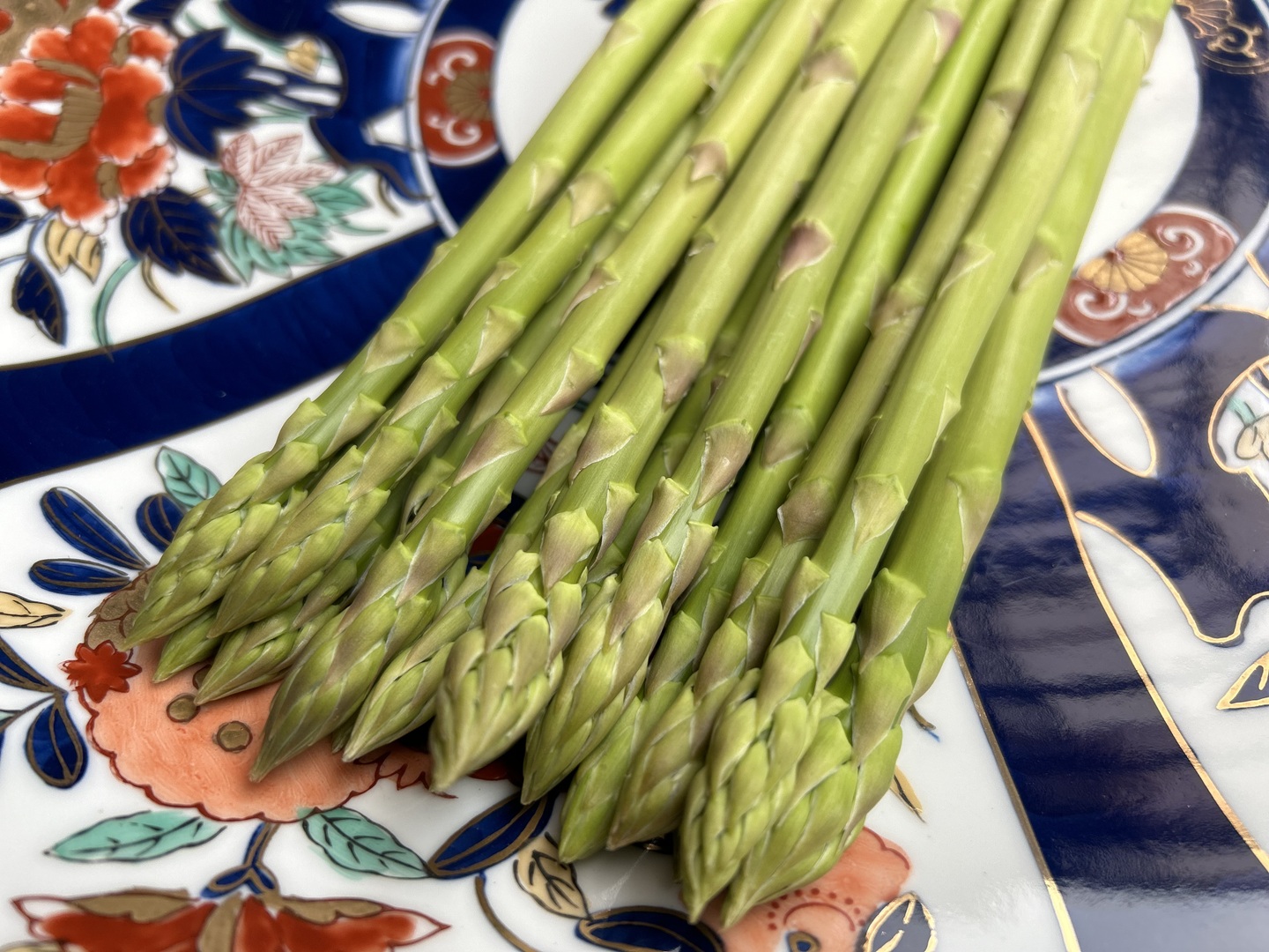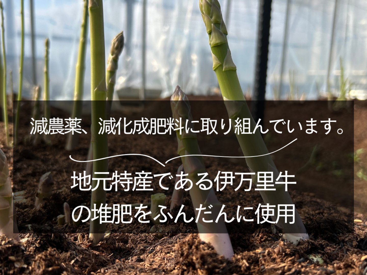 佐賀県伊万里市大川町の八幡岳のふもとで、自然の力で濾過された自噴水と寒暖差の中で育ったグリーンアスパラガスです。