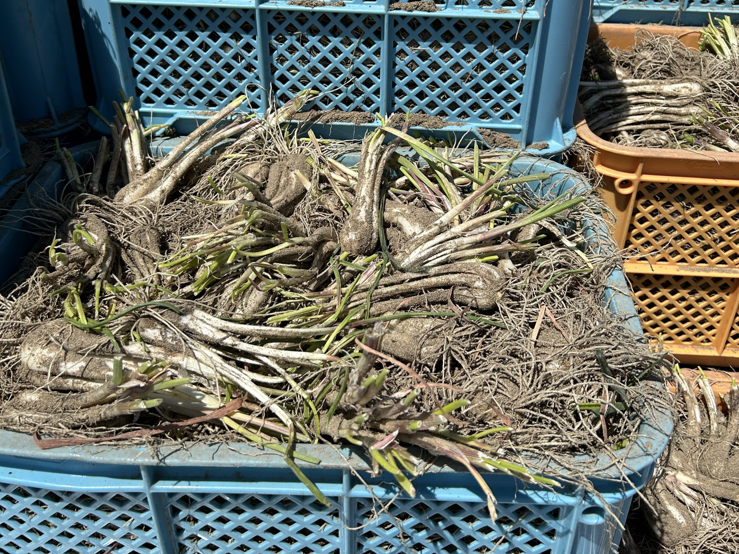 鮮度を保つため、極力手を加えておりません。機械で掘り取り、砂を軽く落として葉と根をそろえるのみでのお届けとなります。