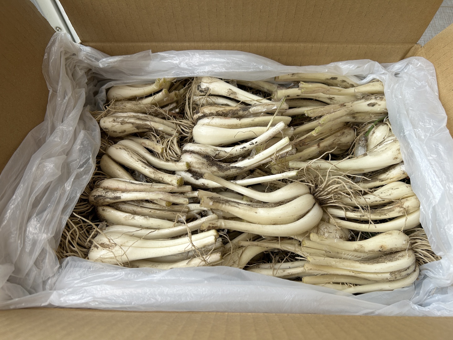 鮮度を保つためらっきょうの粒になるべく触らず、掘り取ったものの茎と根を長さ調整し、砂を軽く落としたものをお送りします。