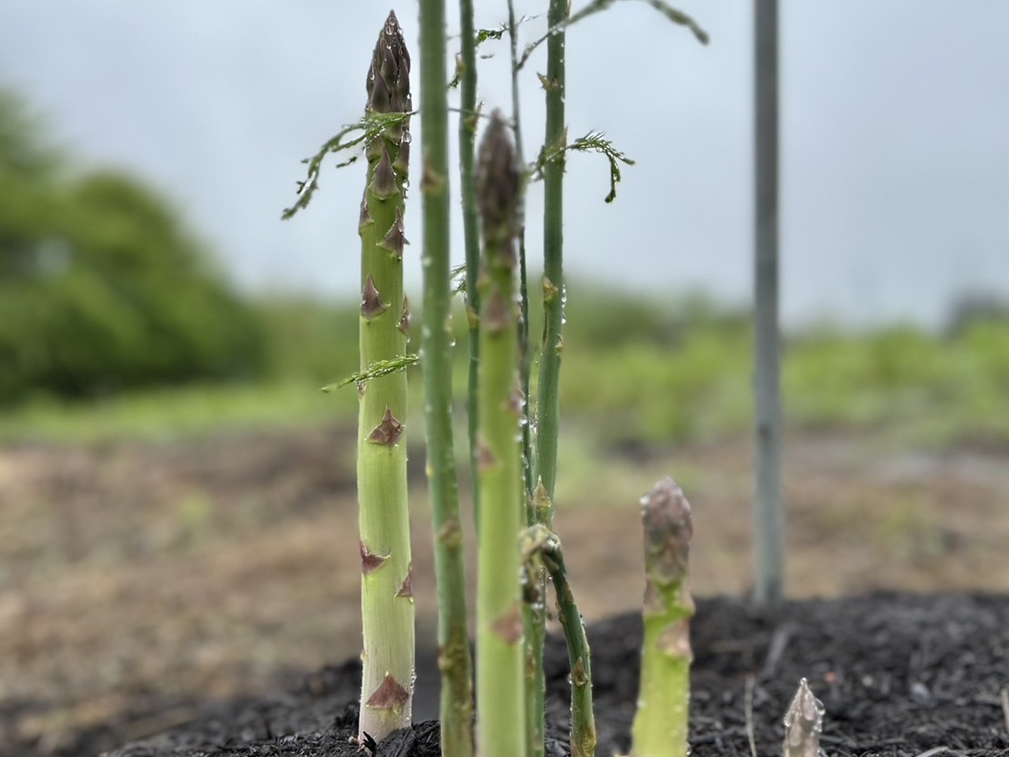(その後のアスパラガスは1株10本前後を残し、秋まで地下茎に栄養分を十分貯えさせ、来年度の芽に備えさせます。)