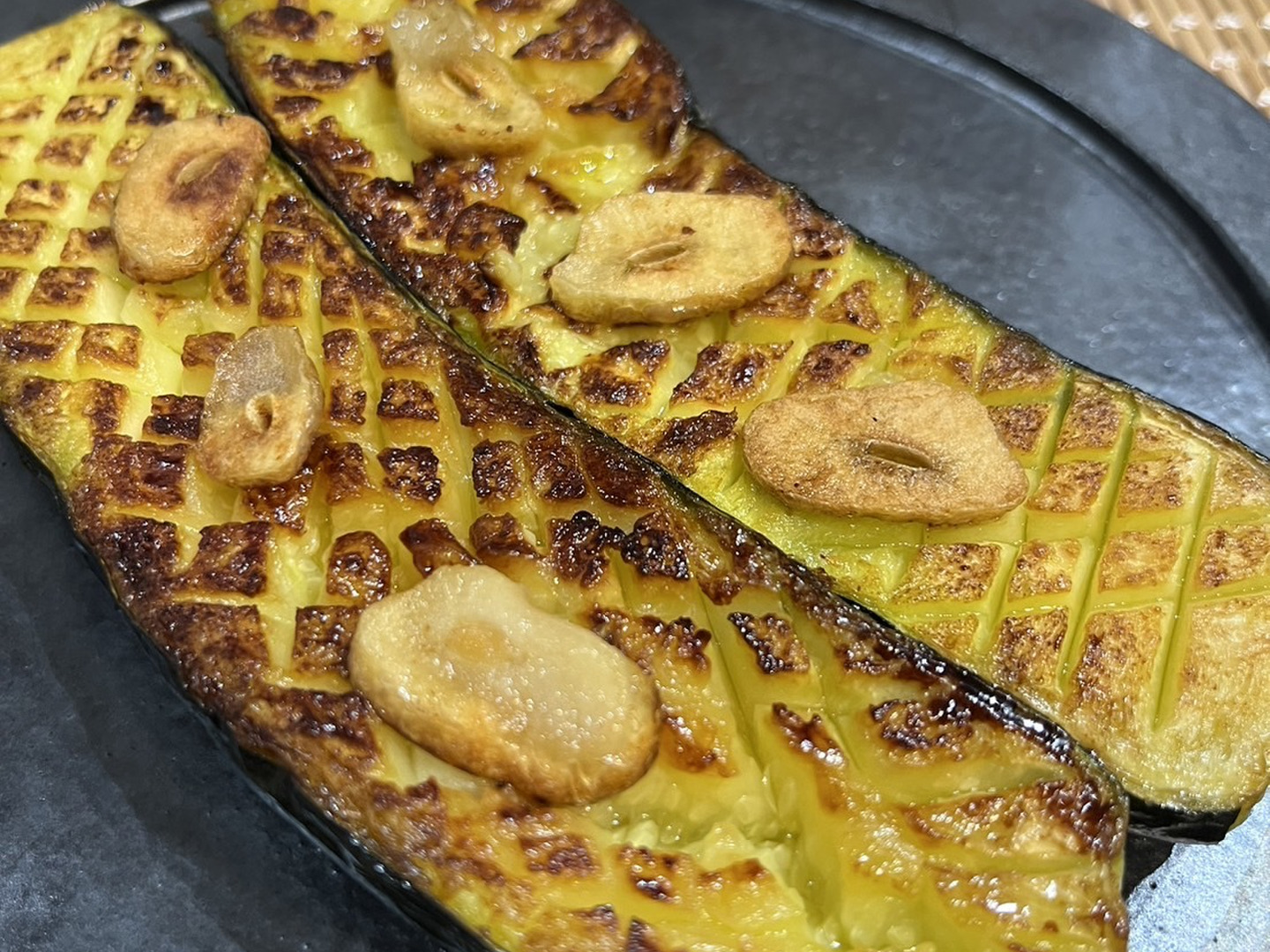縦半分に切ってオリーブオイルでこんがり焼き色をつけてズッキーニのステーキにすればズッキーニ本来の甘みや風味食感を楽しめます。