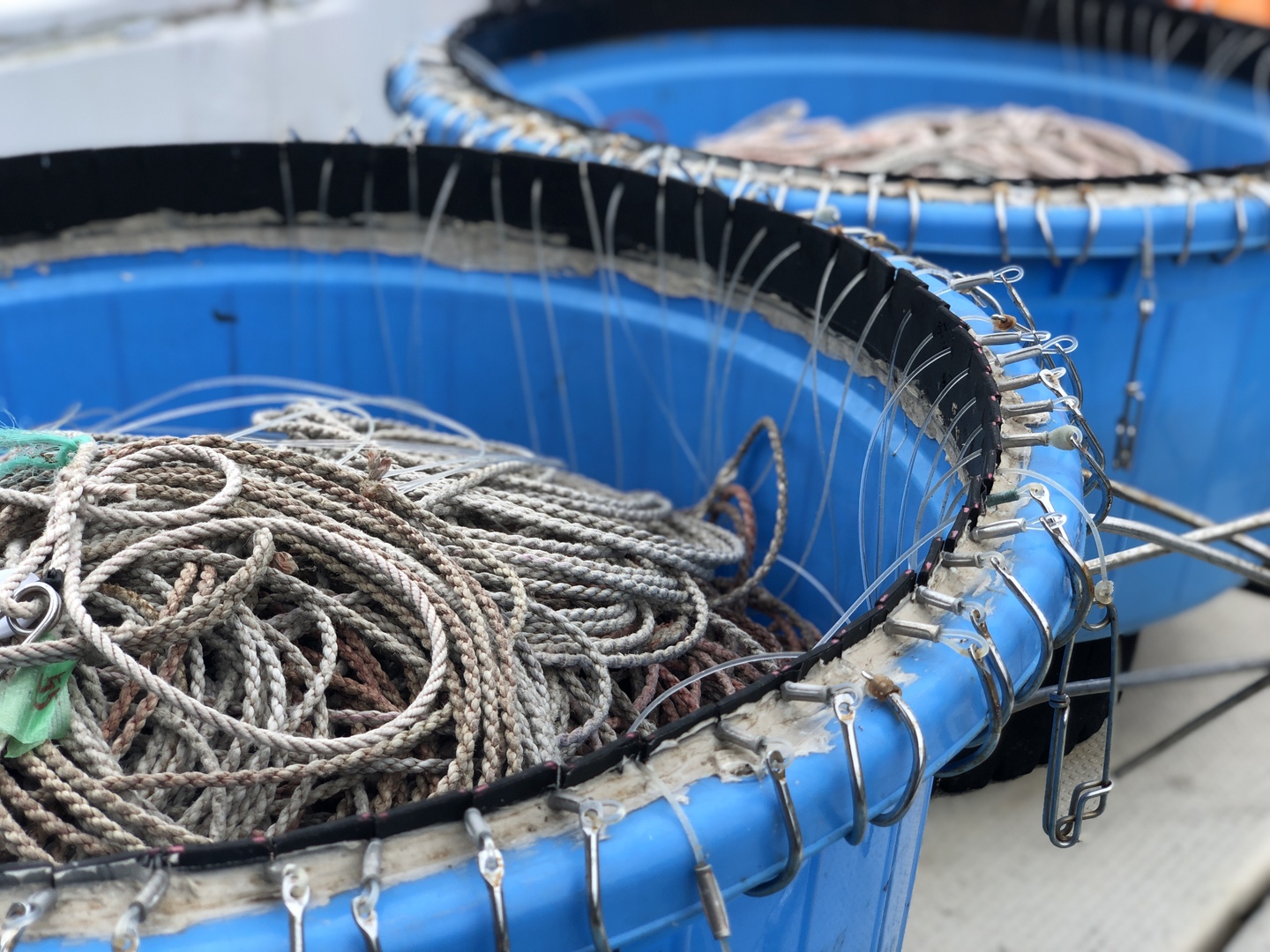はえ縄漁とは、小魚の切り身を餌にした仕掛を海底にしかけクエを釣る漁法のことです。