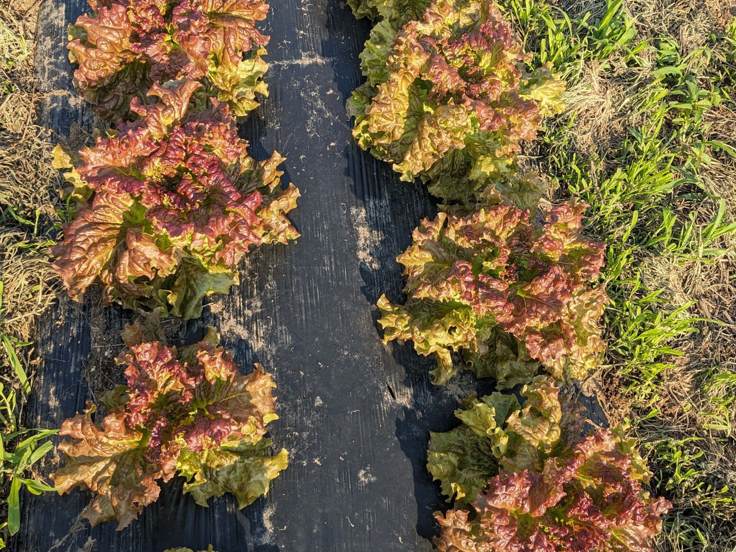 サニーレタスを栽培している畑では農薬・化学肥料・除草剤は使用していません。また肥料も入れておりません。泥跳ね予防にサニーレタスのある部分には黒マルチを敷いていますが、1年前から通路部分に刈った雑草を随時敷いており、それが野菜の栄養となっています。