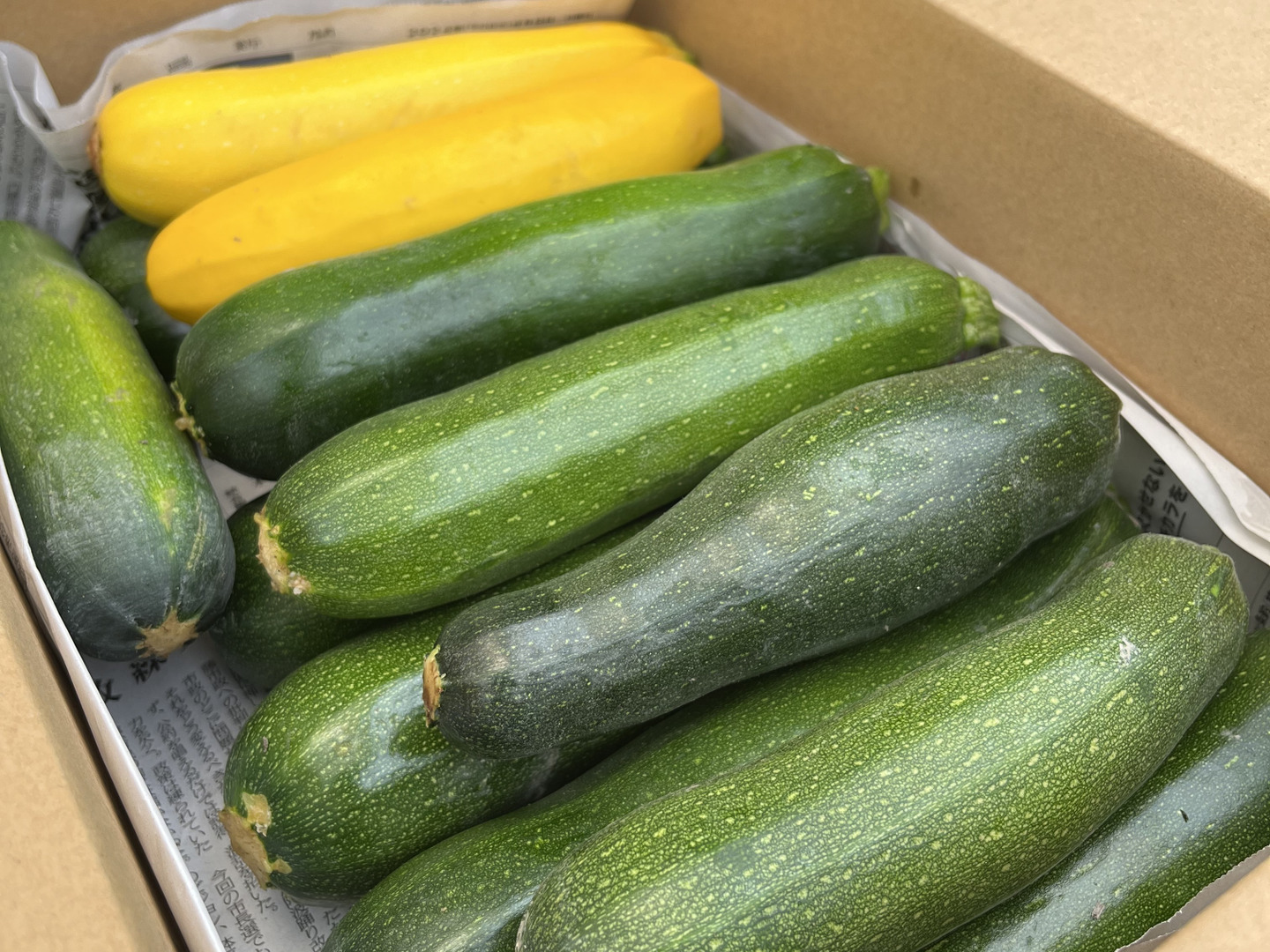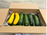 ほとんどは緑色のズッキーニとなりますが、数本黄色のズッキーニが入ります。お料理の彩になりますように。