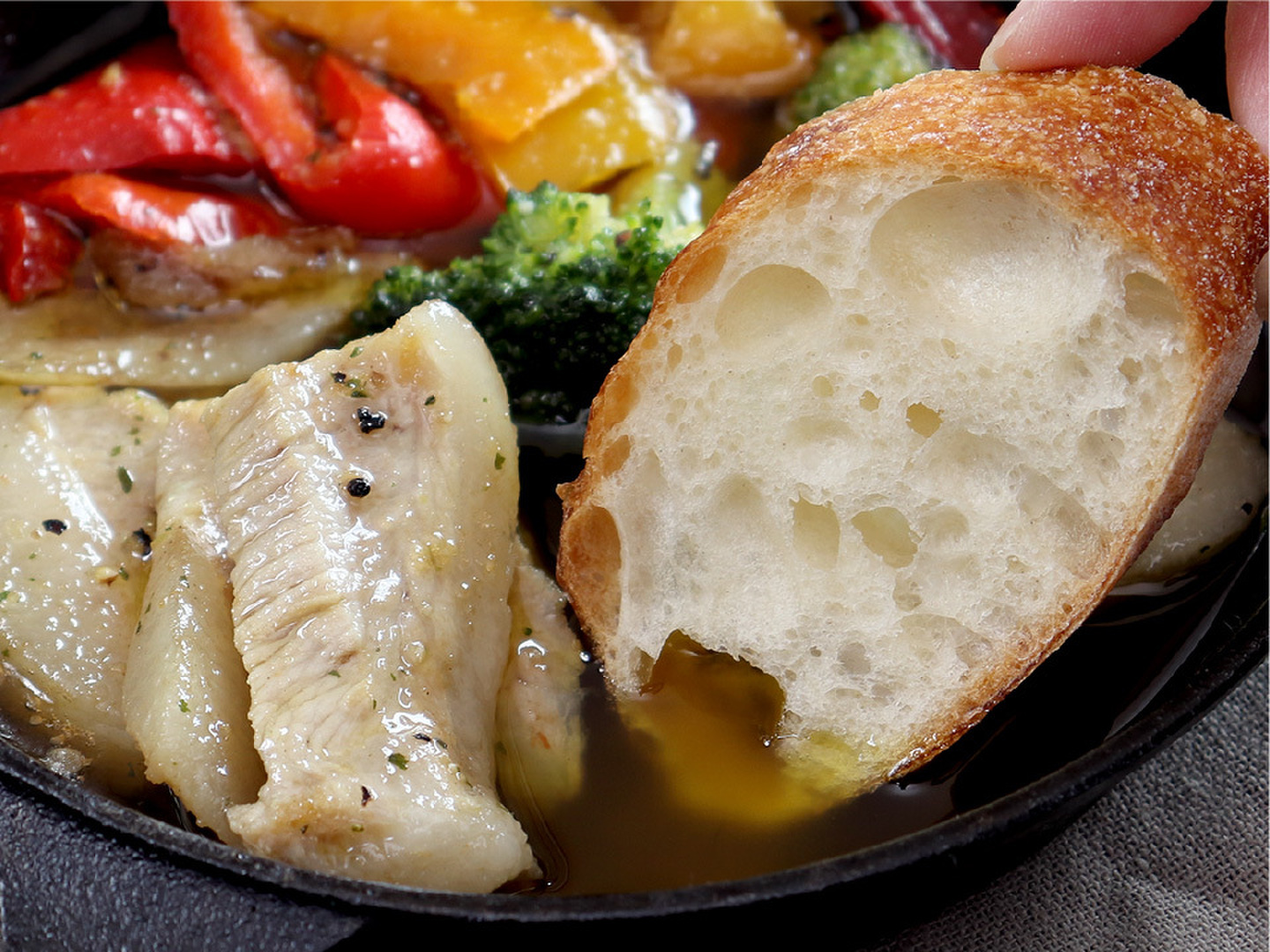 - ガーリックと素材の味が染みこんだオイルは、バゲットに付けてどうぞ!