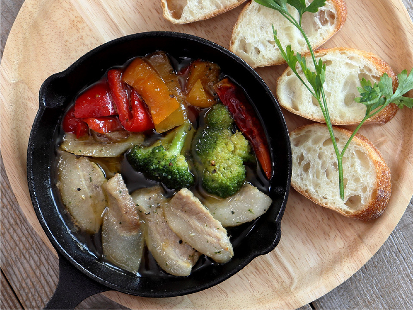 野菜もお肉もオイルも用意不要!湯せんするだけで出来上がる「元気豚 豚トロアヒージョ」200g