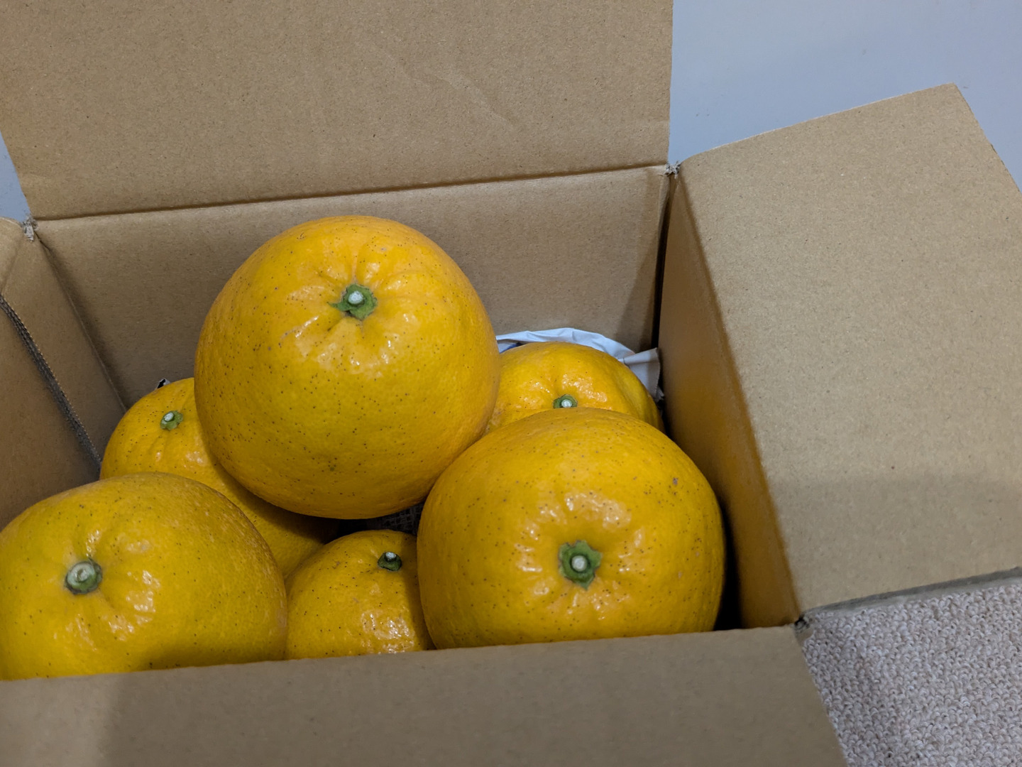 このあたりが黄色いさっぱり系の果実の好みの分かれるところだと思います。販売する側からすると全部おいしいとか、完熟なので甘いですよといえばもっと売れるのですが、自然物なので品種による違い、その時の天候による違い、園地による違い、木による違いがあります。工業製品じゃないので毎年おんなじ味というのは不能です。自然物ゆえの違いをあえて楽しんでください。