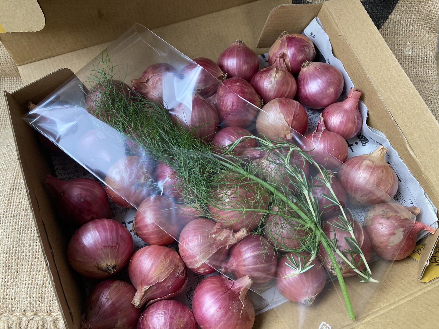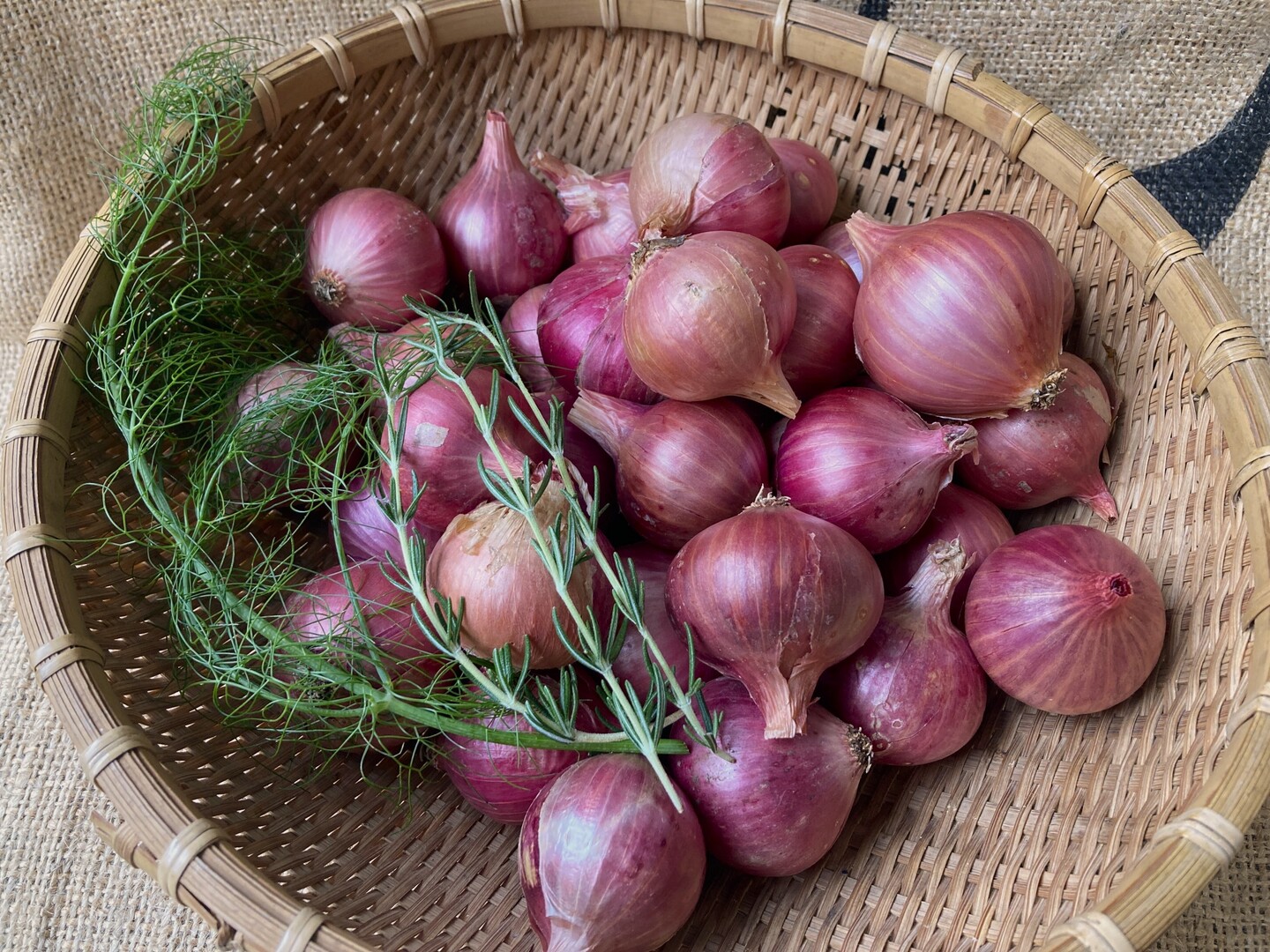 小さめ赤玉ねぎ(紫玉ネギ)を、すぐにピクルスにできるハーブと一緒にお届け。