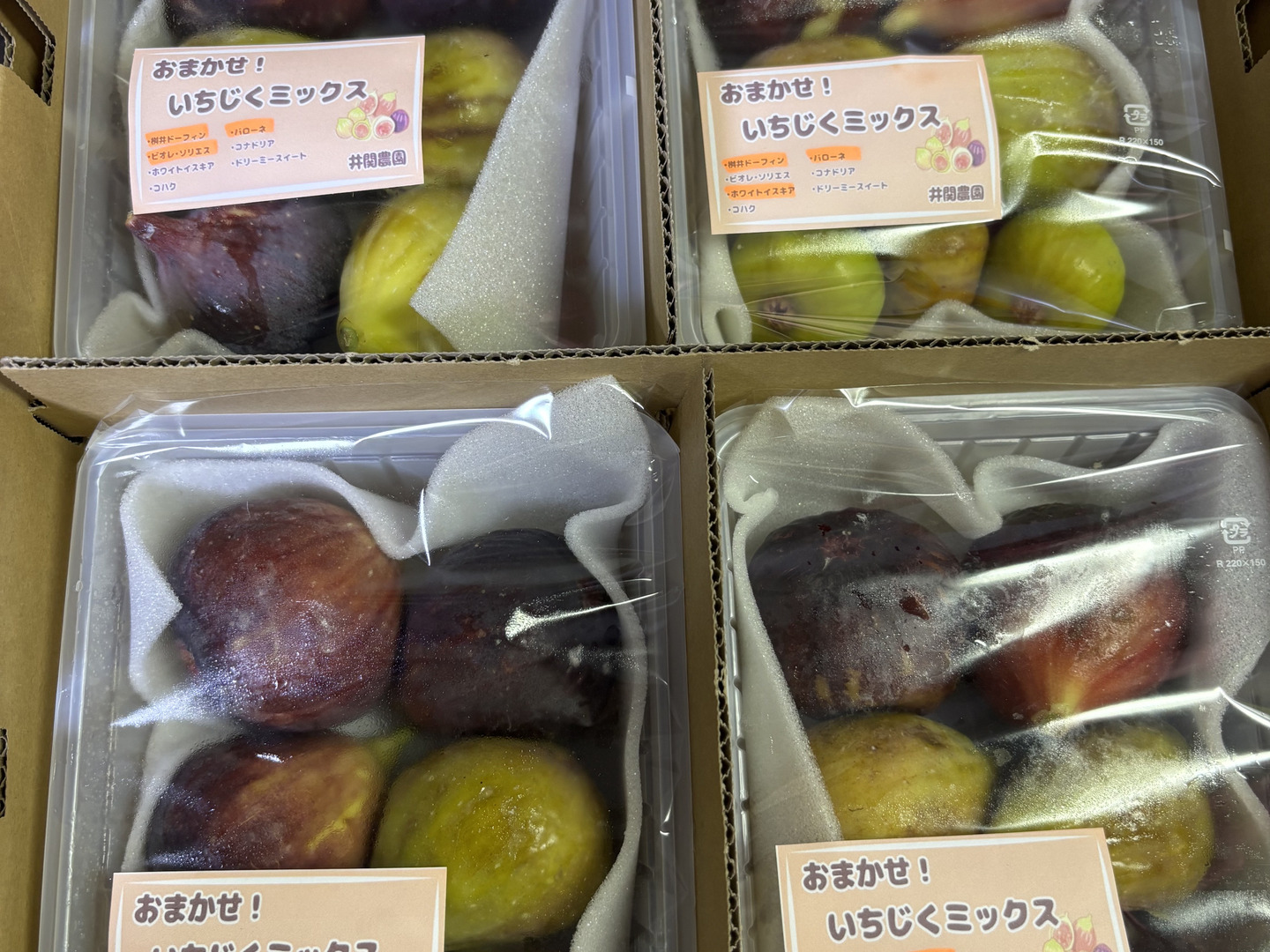 パック詰めしている、品種の名称につきましては、「おまかせ!いちじくミックス」シールの下に栽培全品種が記載されており、パック詰めした品種へマーキングを付けております。