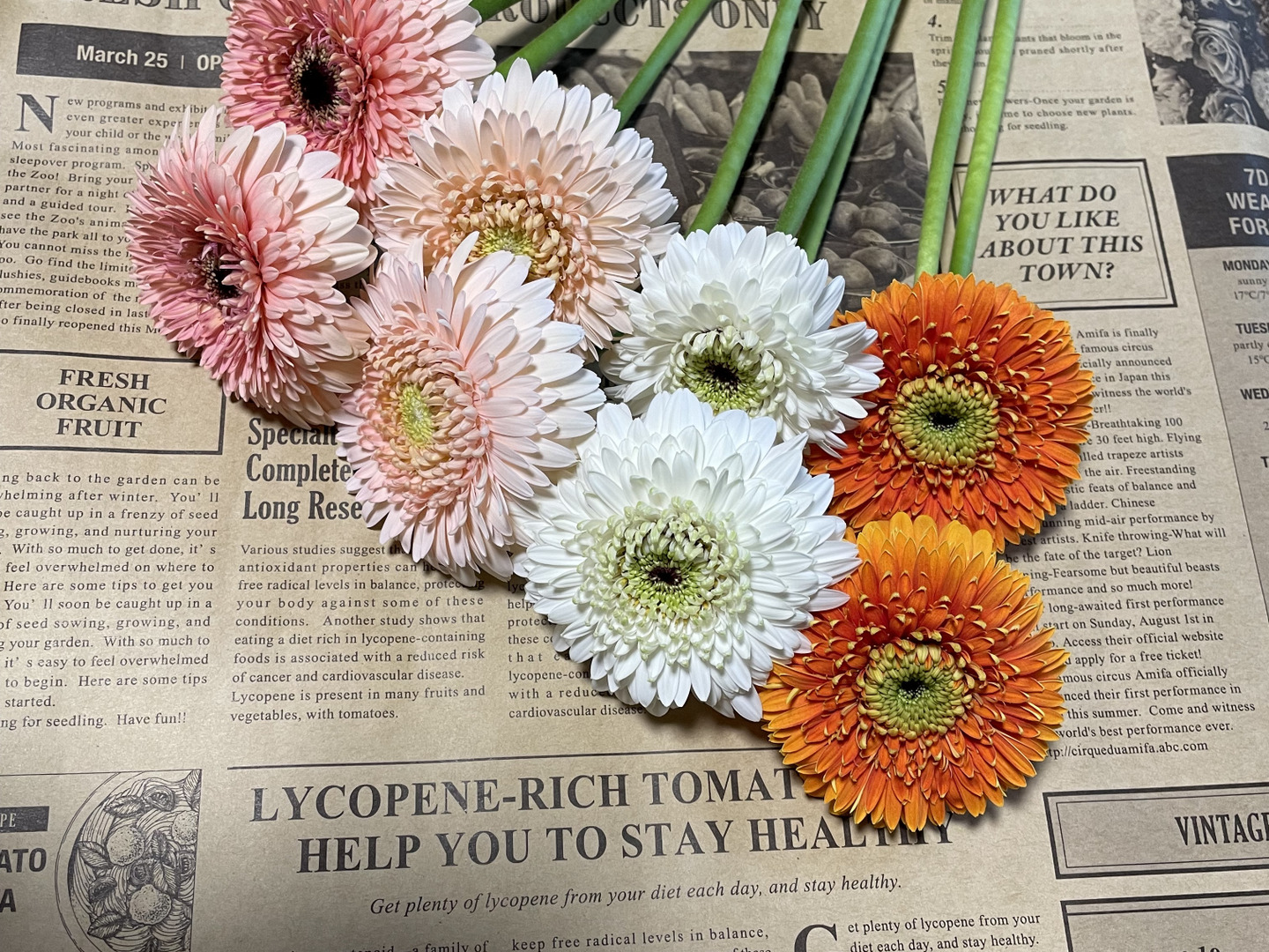 ガーベラは色、品種が多彩です。また一年中咲いておりますので、飽きることなくお楽しみいただけます♪おうち時間をより豊かに♪