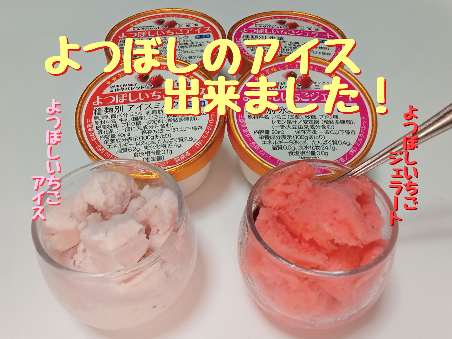 原材料(アイス)…いちご・牛乳・砂糖・生クリーム・脱脂粉乳・ブドウ糖・増粘多糖類・乳化剤(一部に乳成分を含む)