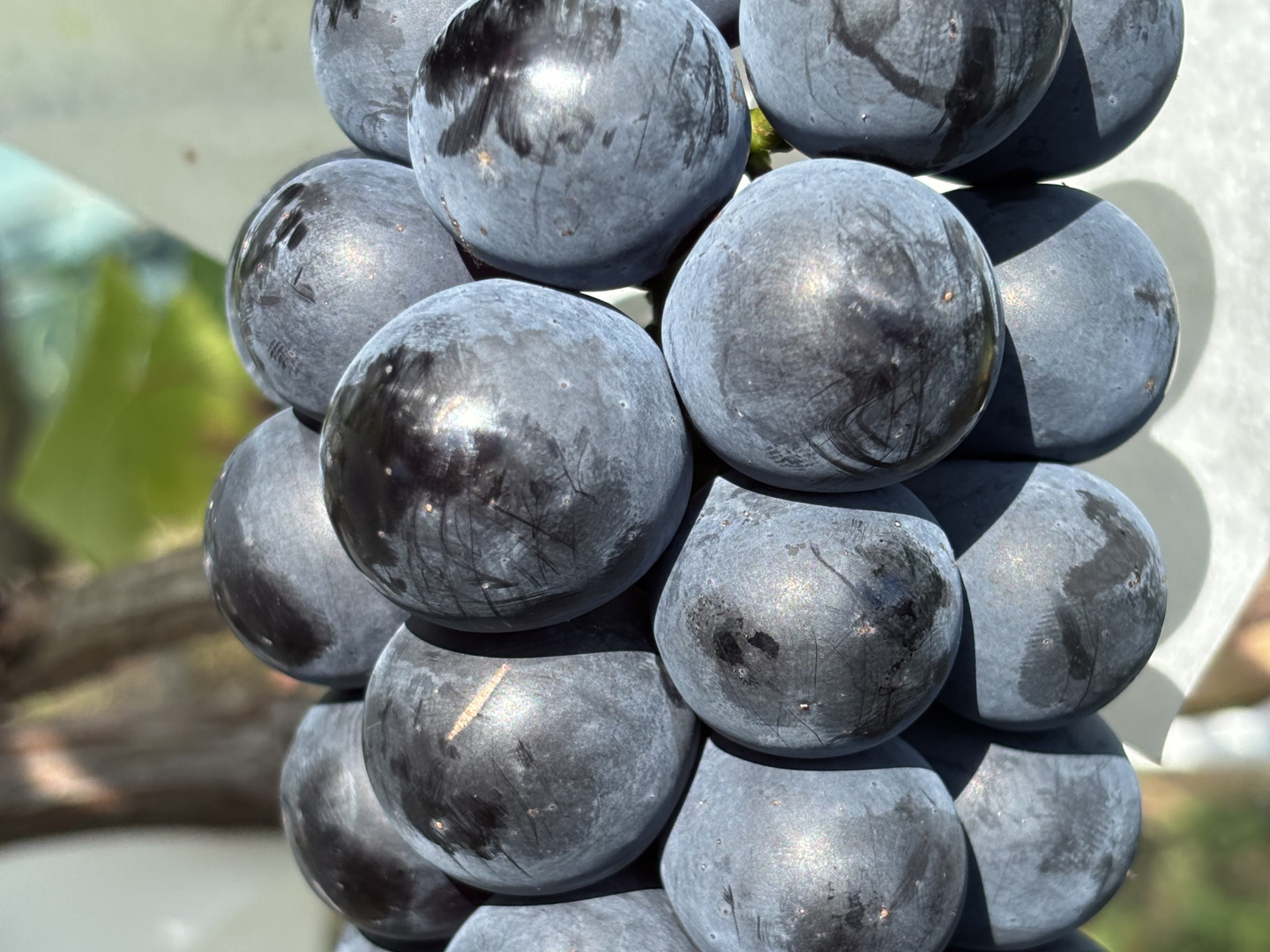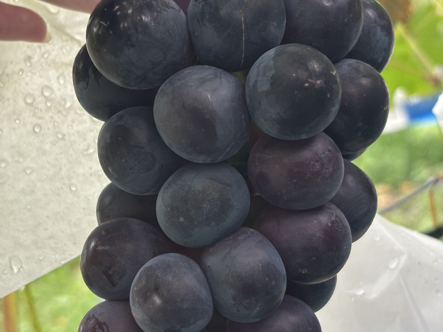 品種の特徴としては巨峰とリザマートを両親に持ち大粒な黒系葡萄で種もなく皮ごとたべられます。
