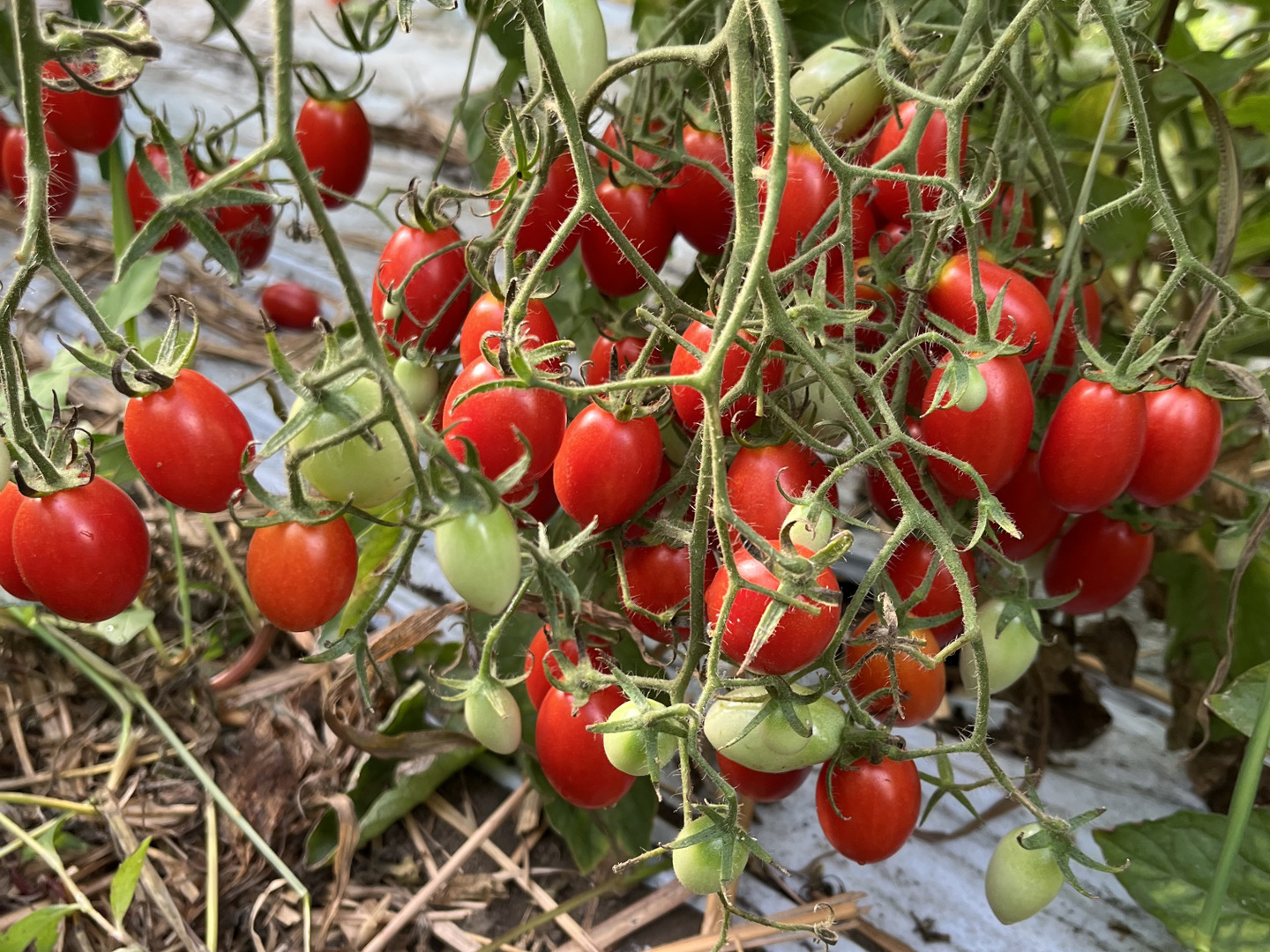 ミニトマトでありますが、皆様がイメージ丸いミニトマトのような形ではありません。細長いミニトマトになります。