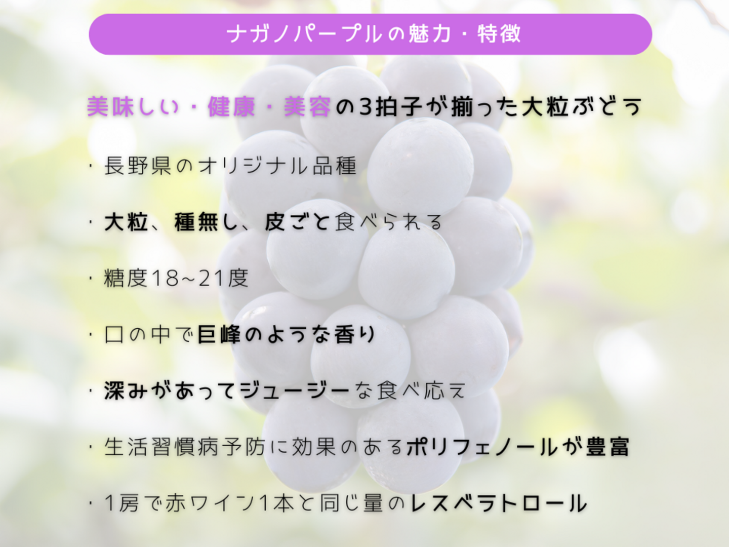 ・ぶどうの栽培には最大限の力を注いでおりますが、農産物であるため、形、大きさ、味わい、糖度などが必ず同じものをお届けすることはできません。