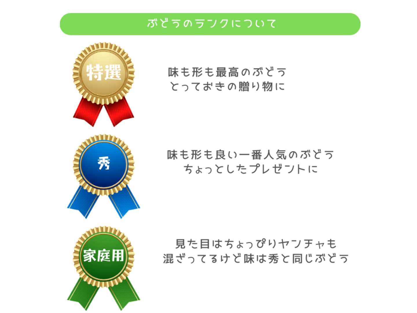 当園独自の企画基準である「特選」、「秀」には該当しませんが、ご家庭で召し上がるのであれば十分ご満足頂けるぶどうです。