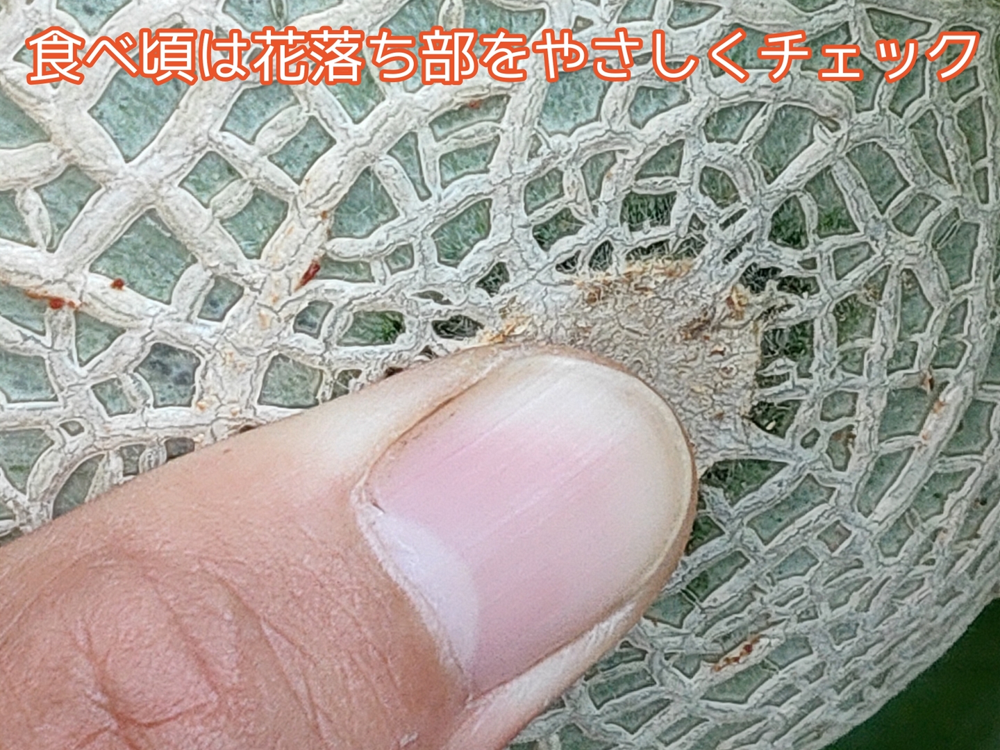 メロンの底側には「花落ち」と呼ばれるコルク質の部分があります。メロンの花びらがくっ付いていた場所です。ここを”優しく”押してみてください。弾力のある柔らかさであれば食べ頃です。(一般の店頭のメロンを購入前に押すのはやめてくださいね!)