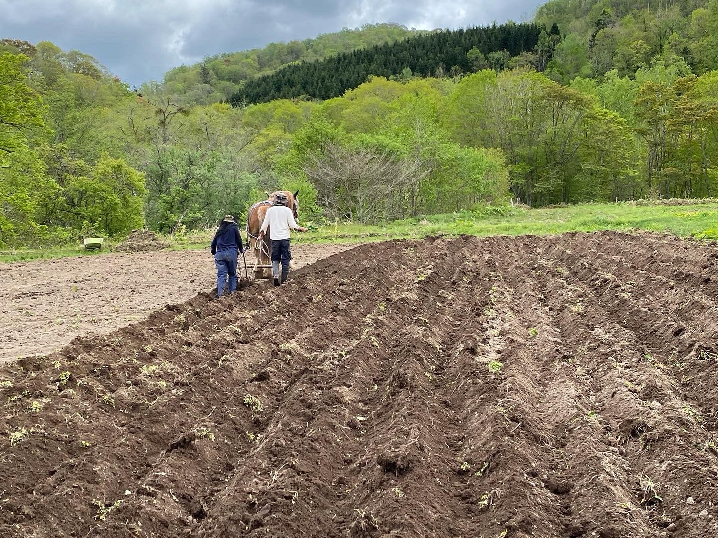 馬耕で土起こし畝立てをして、馬糞堆肥を使う、