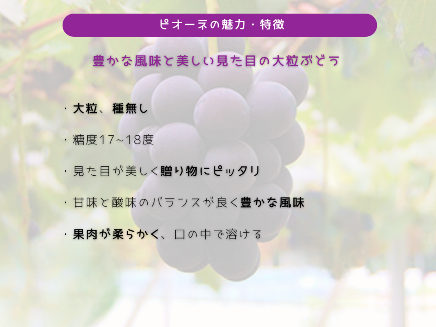 ・ぶどうの栽培には最大限の力を注いでおりますが、農産物であるため、形、大きさ、味わい、糖度などが必ず同じものをお届けすることはできません。