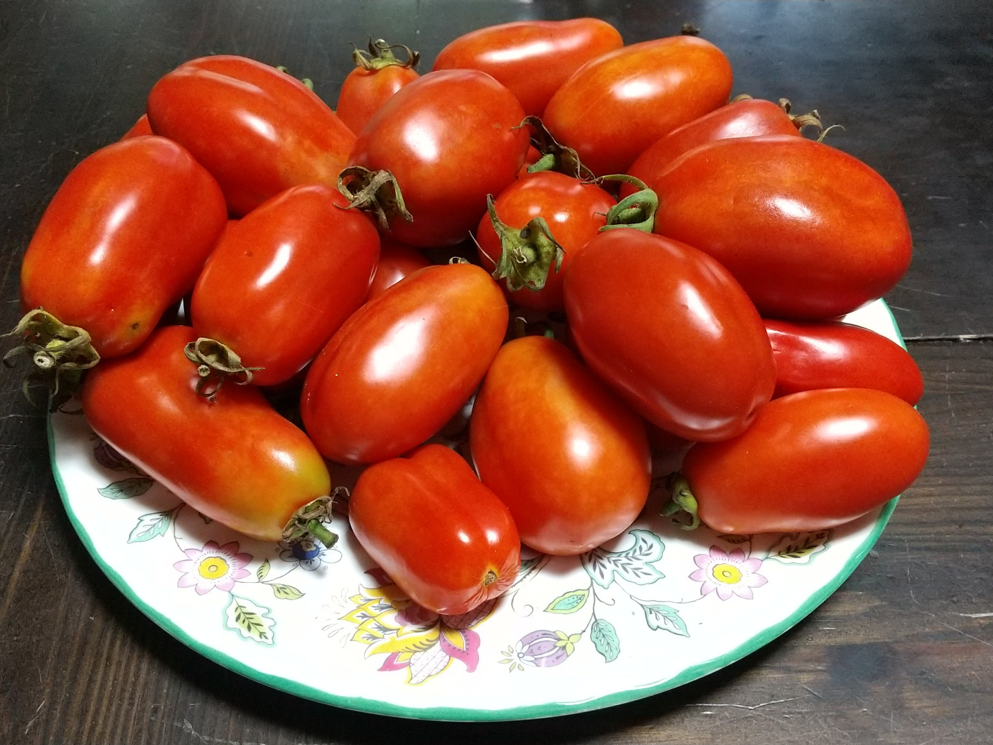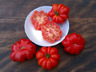 サンマルツァーノはカキやムール貝のような形で、パスタ料理やトマトソースに最適です。サンマルツァーノが少ない場合、同じような品種のモルト・ヴォーノが入ることもあります。ご了承ください。もう二種はサンライズ・ソース(ローマ・タイプ)とコストルートです。サンライズ・ソースは橙色の大きい卵のような感じ。風味よく、短時間の加熱で果肉にとろみがでてソース状になり、トマトケチャップや保存用ソース作りには最適ということです。コストルート・フィオレンティーノは茶巾のような形で、スライスすると菊の花が咲いたようでとてもきれいです。それぞれ半々くらいの分量でお送りします。