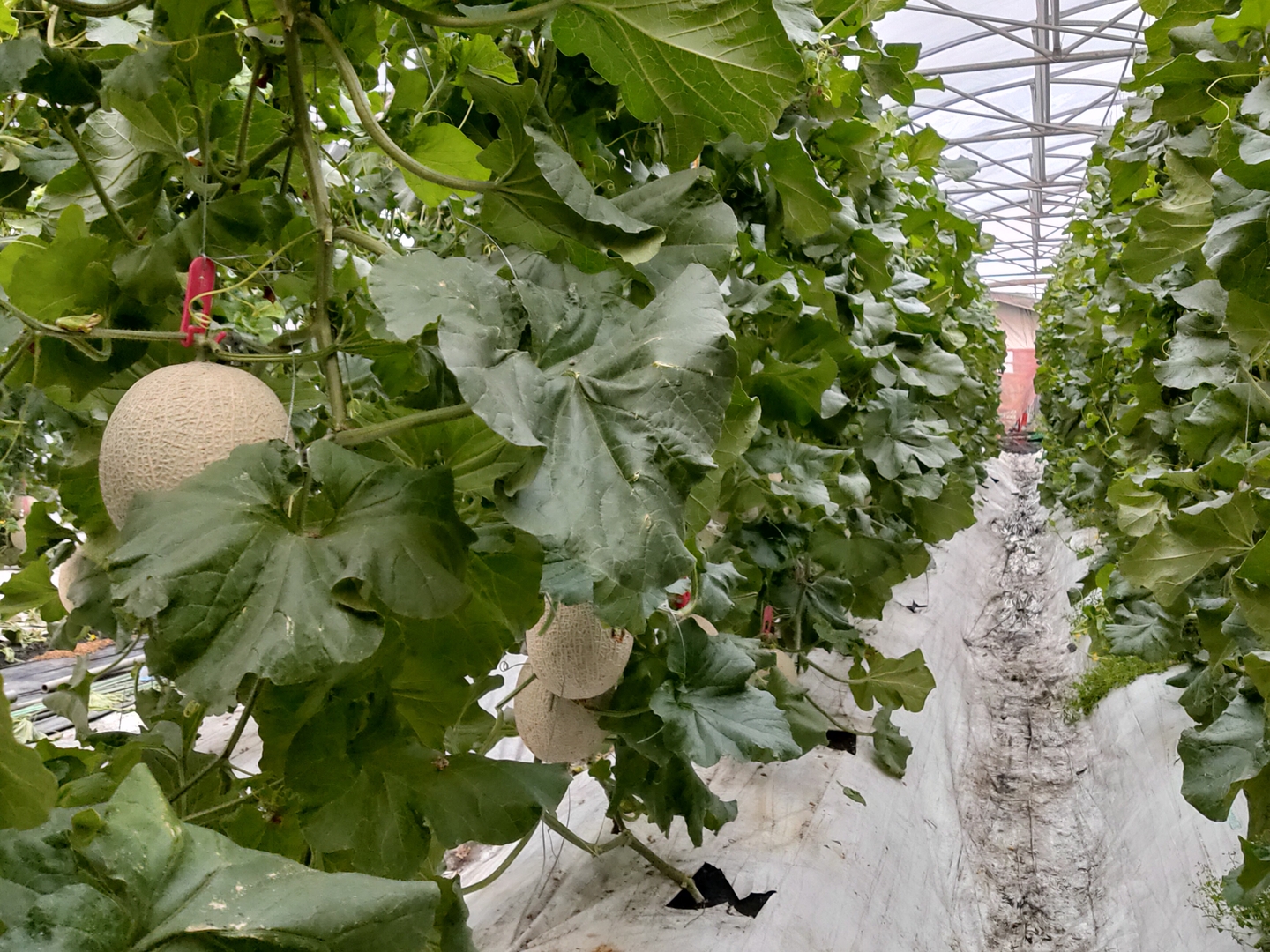 メロンを一本ずつ吊り上げて栽培するので、手間の掛かる方法ではありますが、メロンの果実を空中で育てることができちゃうんです。こうすることでメロンの葉っぱや果実の風通しが向上するので、病害のリスクを軽減しつつ、品質の向上を図っています。