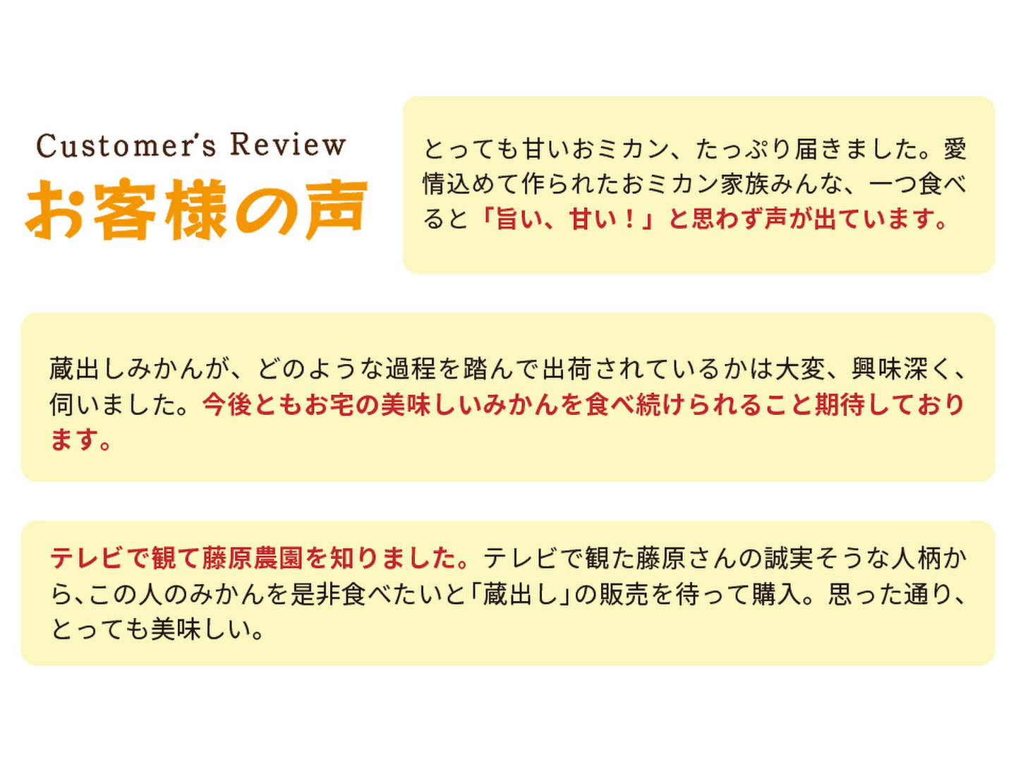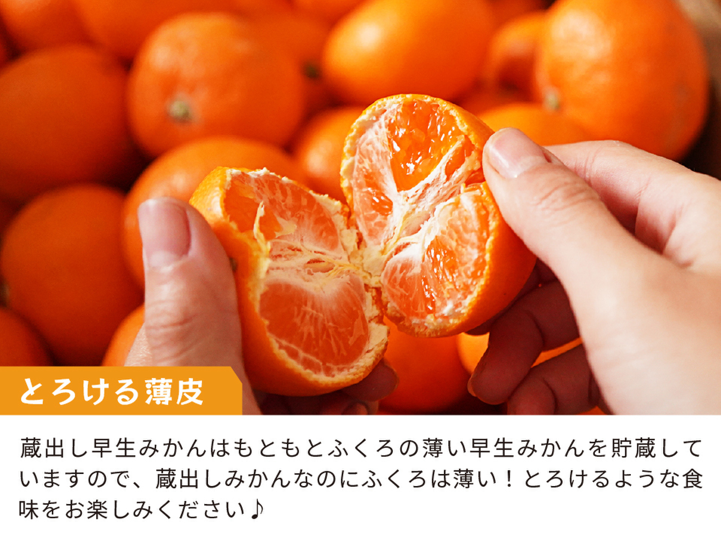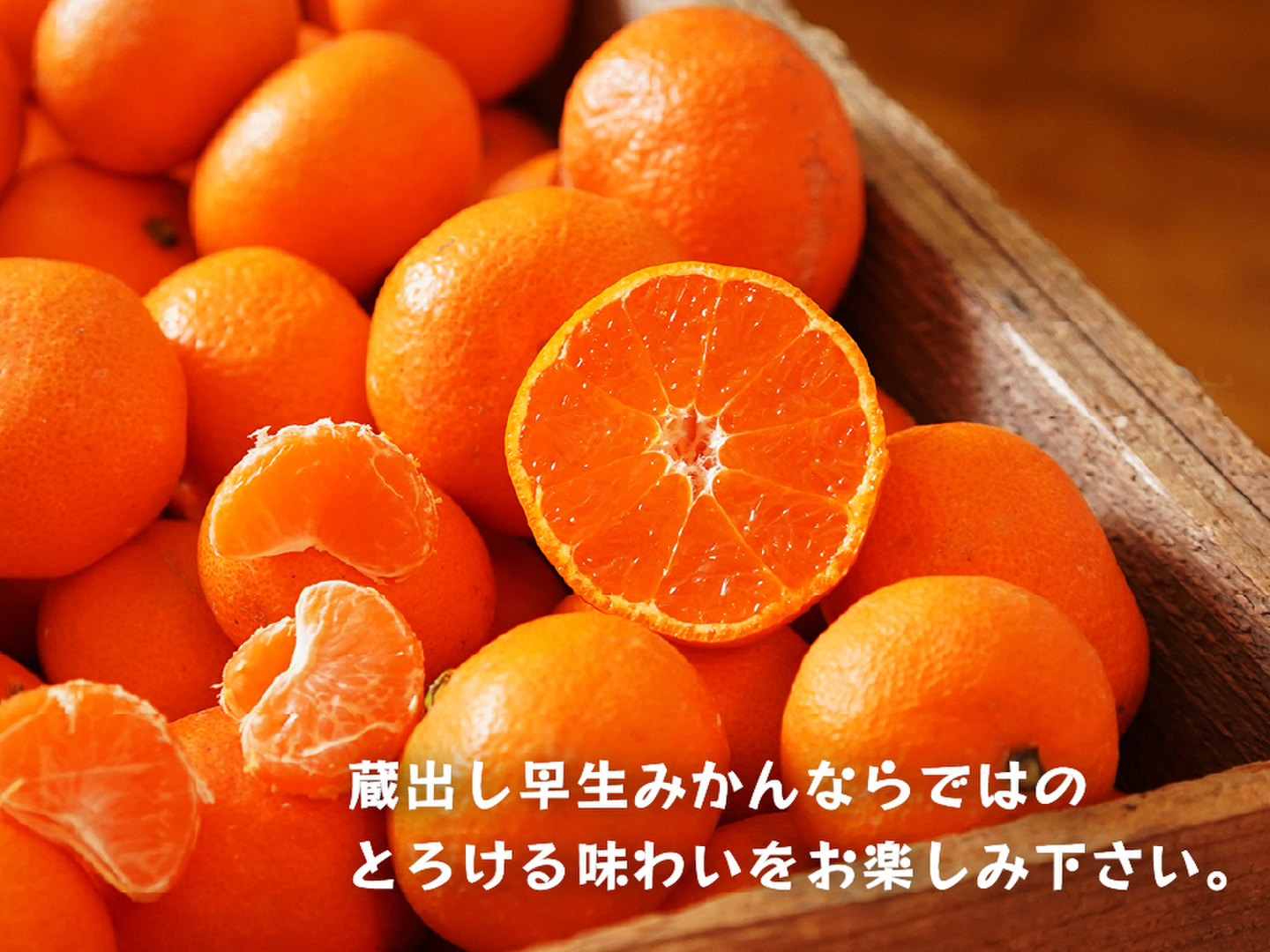 早生みかんはふくろが薄くとろけるような味わいが特徴。袋が薄いため貯蔵が難しいこともあり、そのほとんどは年末に無くなってしまいますが、当園は貯蔵産地ですので年明けも蔵出し早生みかんとして出荷致します。読込中