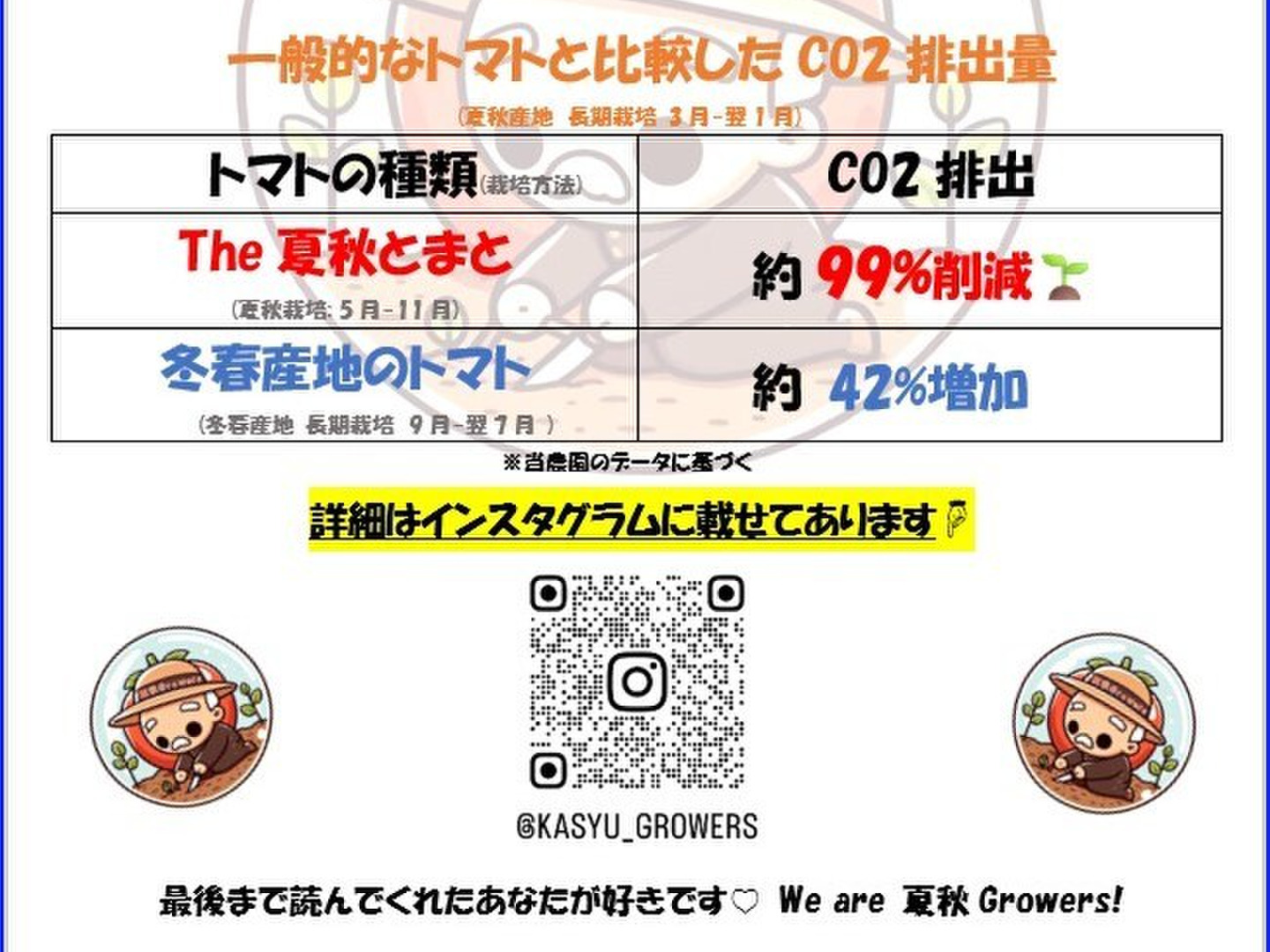 長期栽培(3月-翌1月)が主流で、高冷地ならではの省エネ栽培で、九州では主流の冬春産地のトマトと比べ、およそ40%以上のCO2排出をカットでき、環境にやさしく、またおいしいトマトが作られています。
