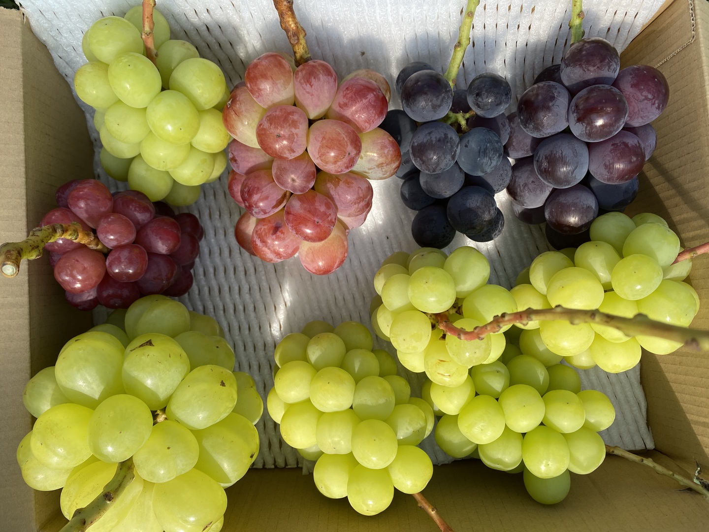シャインマスカットを親にもつ、次世代レア新品種。大きいもので1房1キロにもなるドスコイぶどう。見た目に反し、酸味と甘味のバランスがよく、食べる手がとまらなくなる。