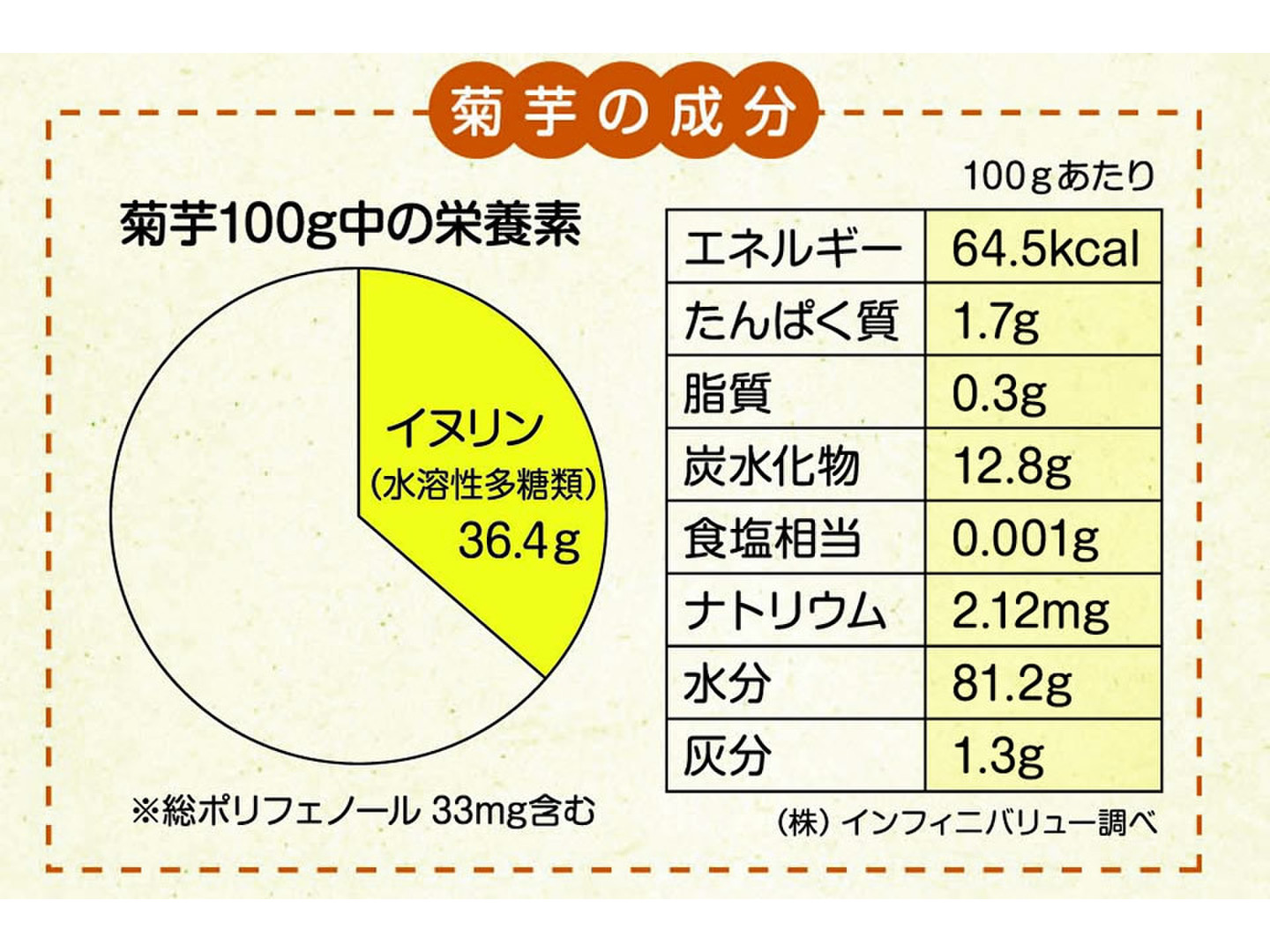 菊芋には水溶性食物繊維のイヌリンが豊富に含まれており、一般に食物繊維は整腸、血糖値抑制に効果があると言われています。