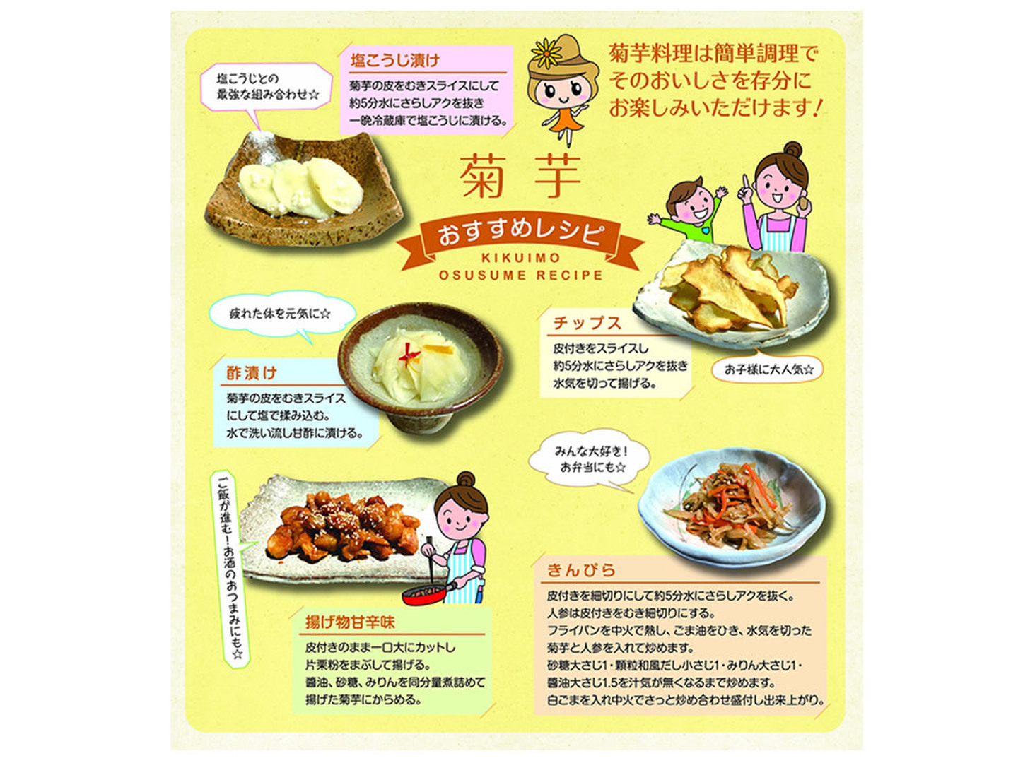 キクイモは皮ごと食べれますので揚げ物、煮物、汁物、サラダ、カレー、きんぴら等に適しています。